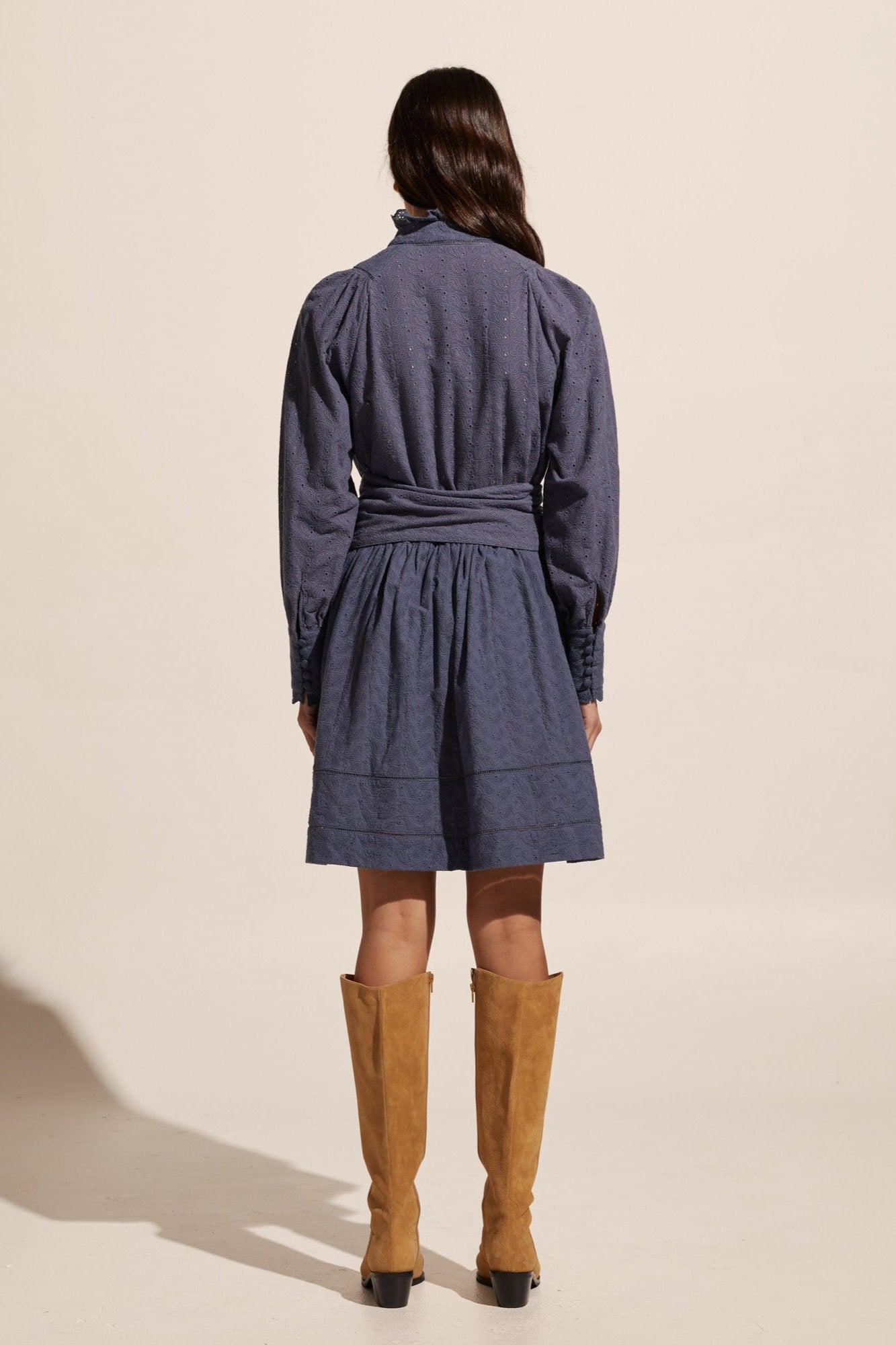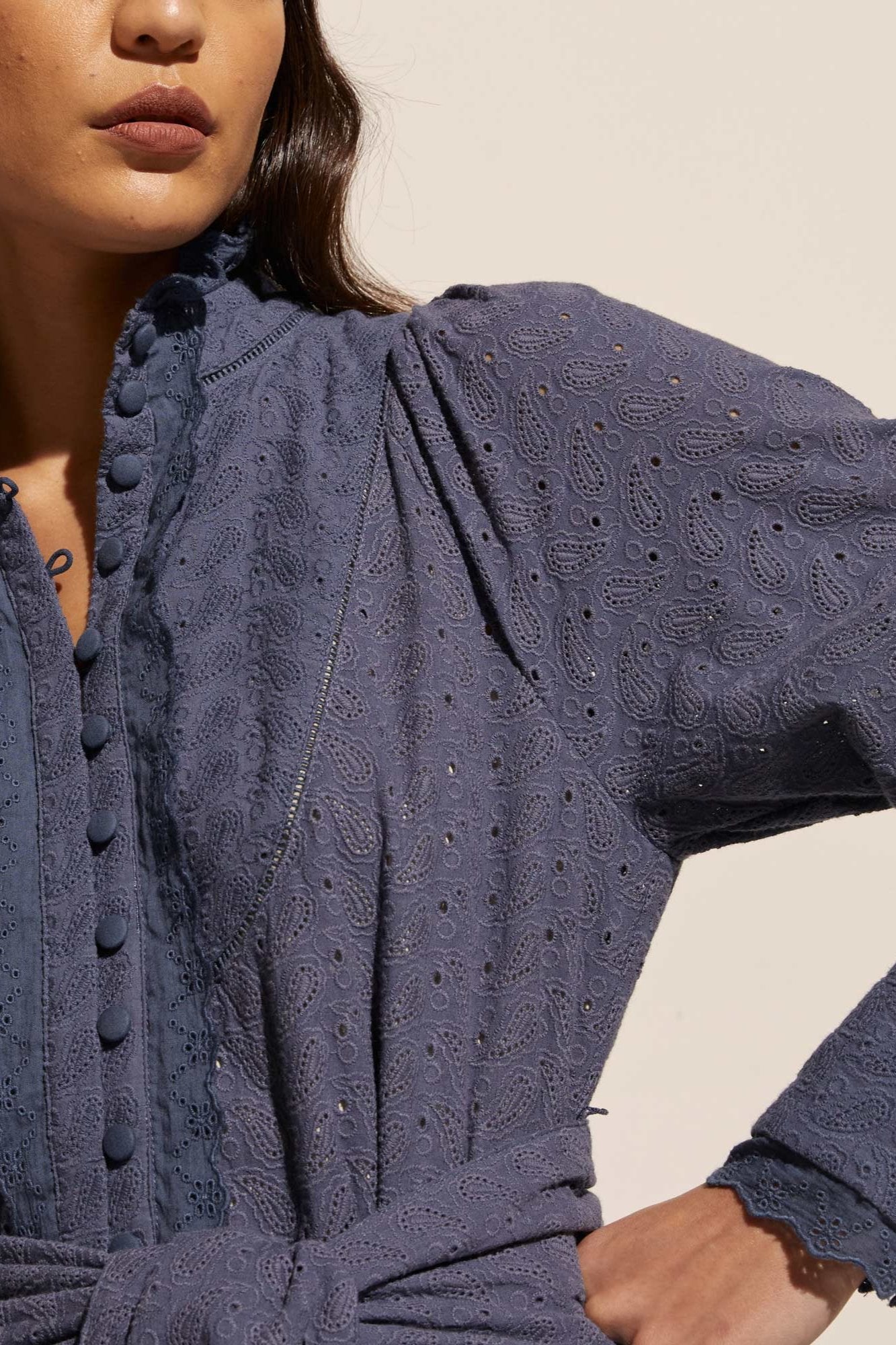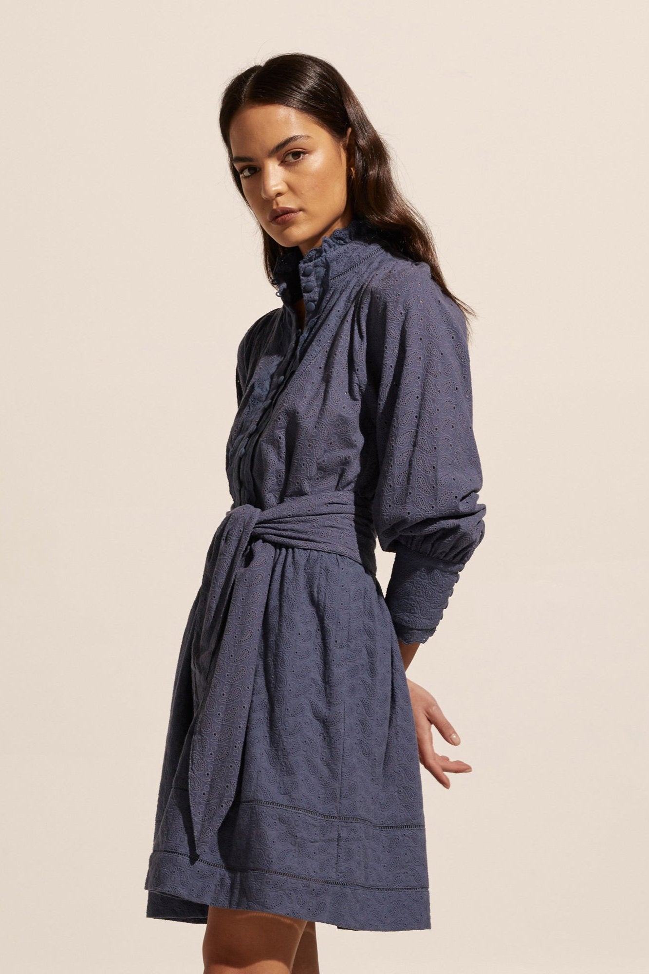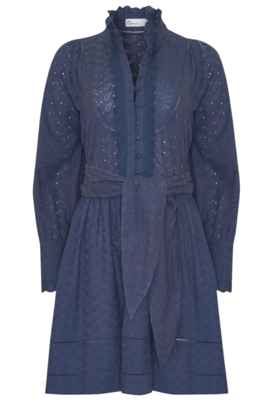 Class in comfort, the Valour Dress by Zoe Kratzmann takes the quintessential cotton winter dress and deconstructs it with a unique, 70's inspired perspective. Its structured bishop sleeve, high neckline, and wide self-tie belt give the dress a on-trend, modern silhouette. With feminine covered buttons and intricate lace trim detailing, this dress is sure to become your new go-to. style with knee-high boots and a trench for on-point autumn style.