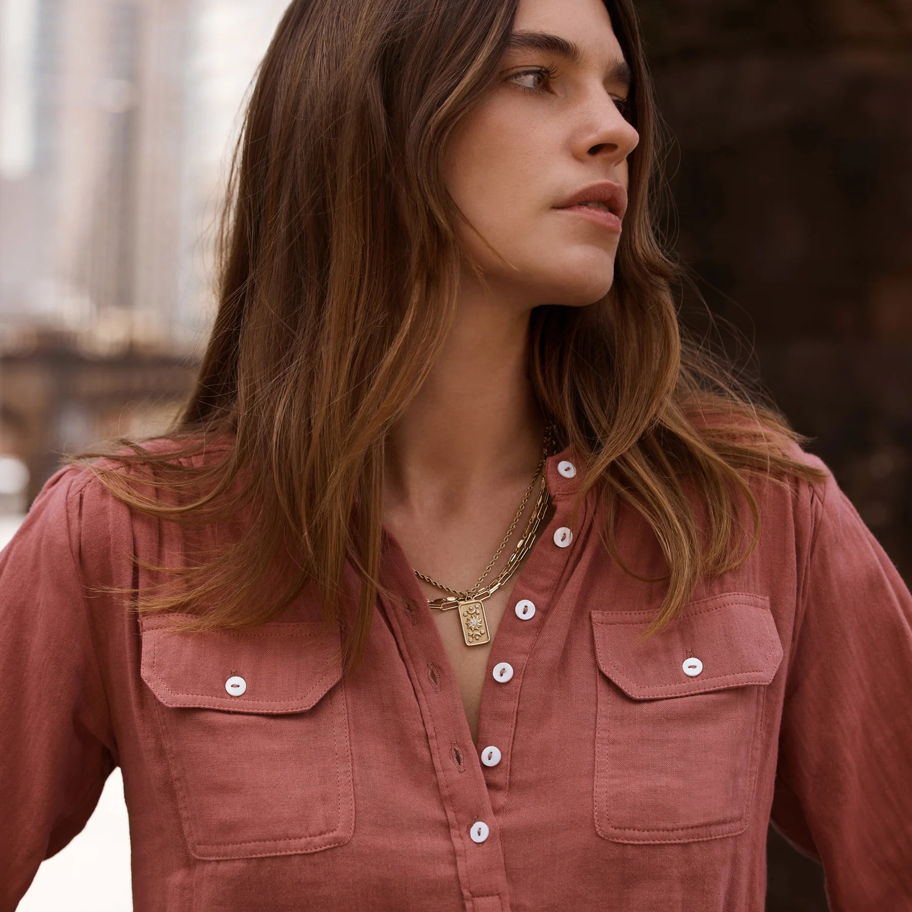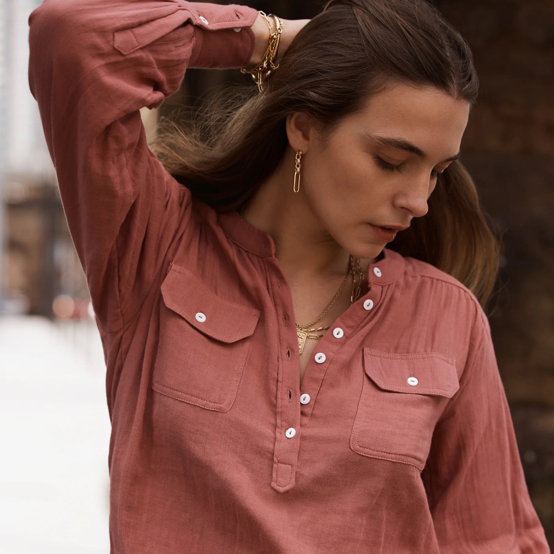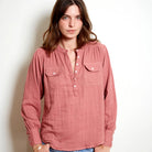 Our classic Amelie blouse with softly gathered front & back yoke and fold up cuff for varied length. Also Available in Blue/Gold Stripe.