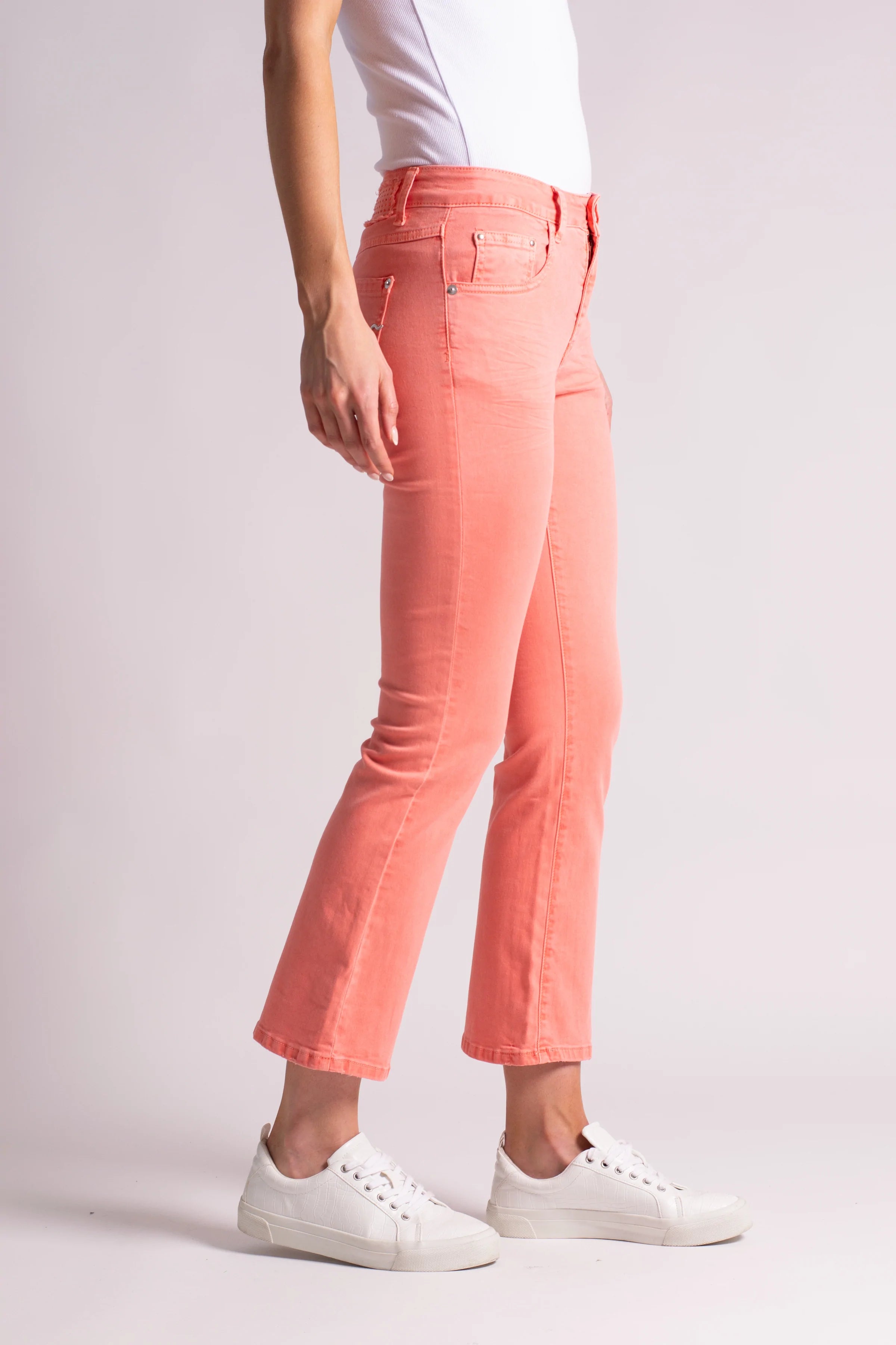A super soft and stretchy light weight cropped jean that is comfy and colourful. The Camila Jean by Bainco have detail with a diamonté embellishment on back label. Also available in Green , Light Denim and Camel.