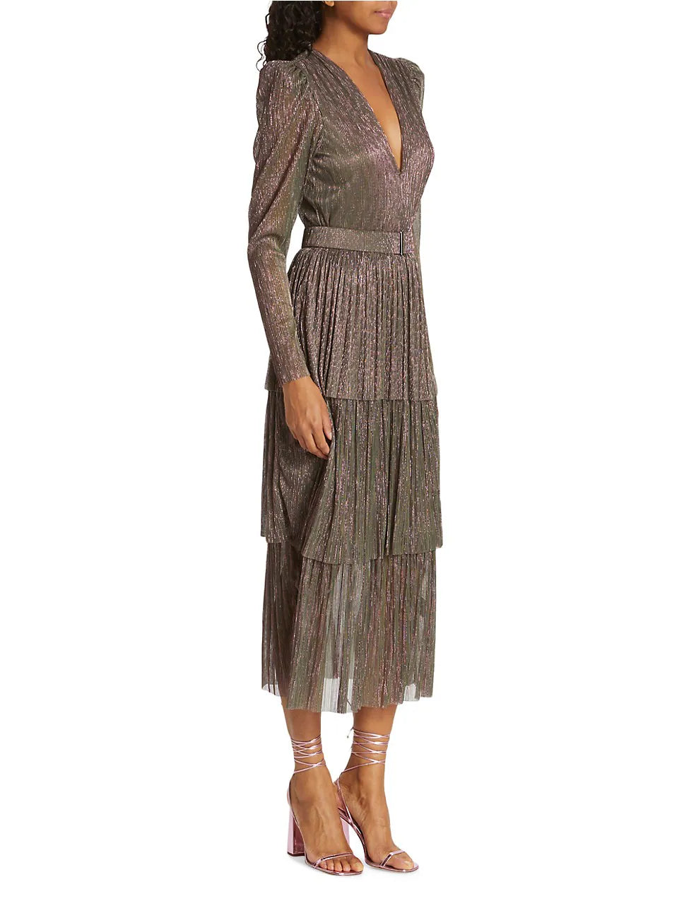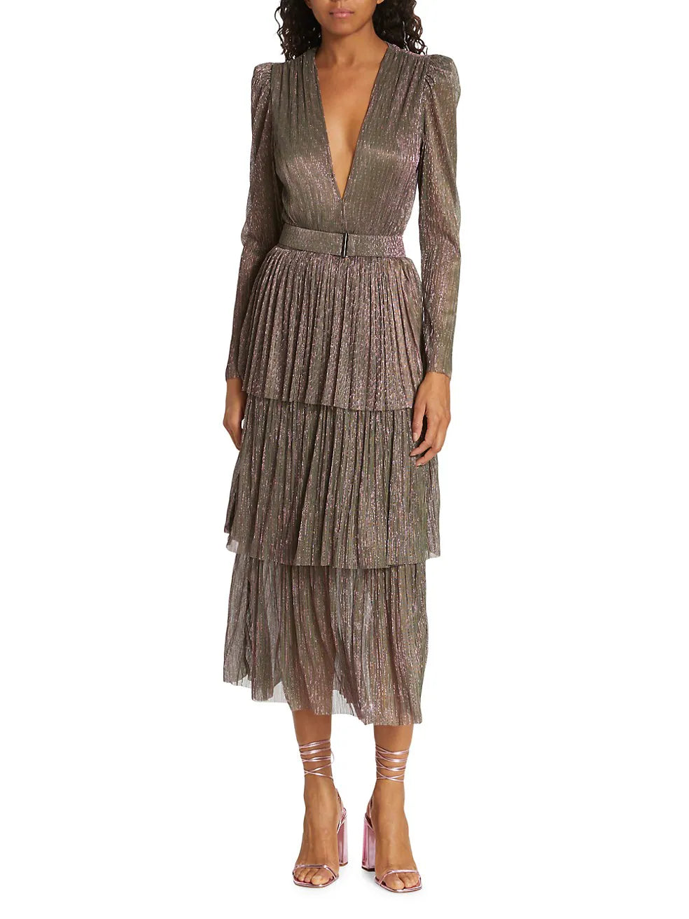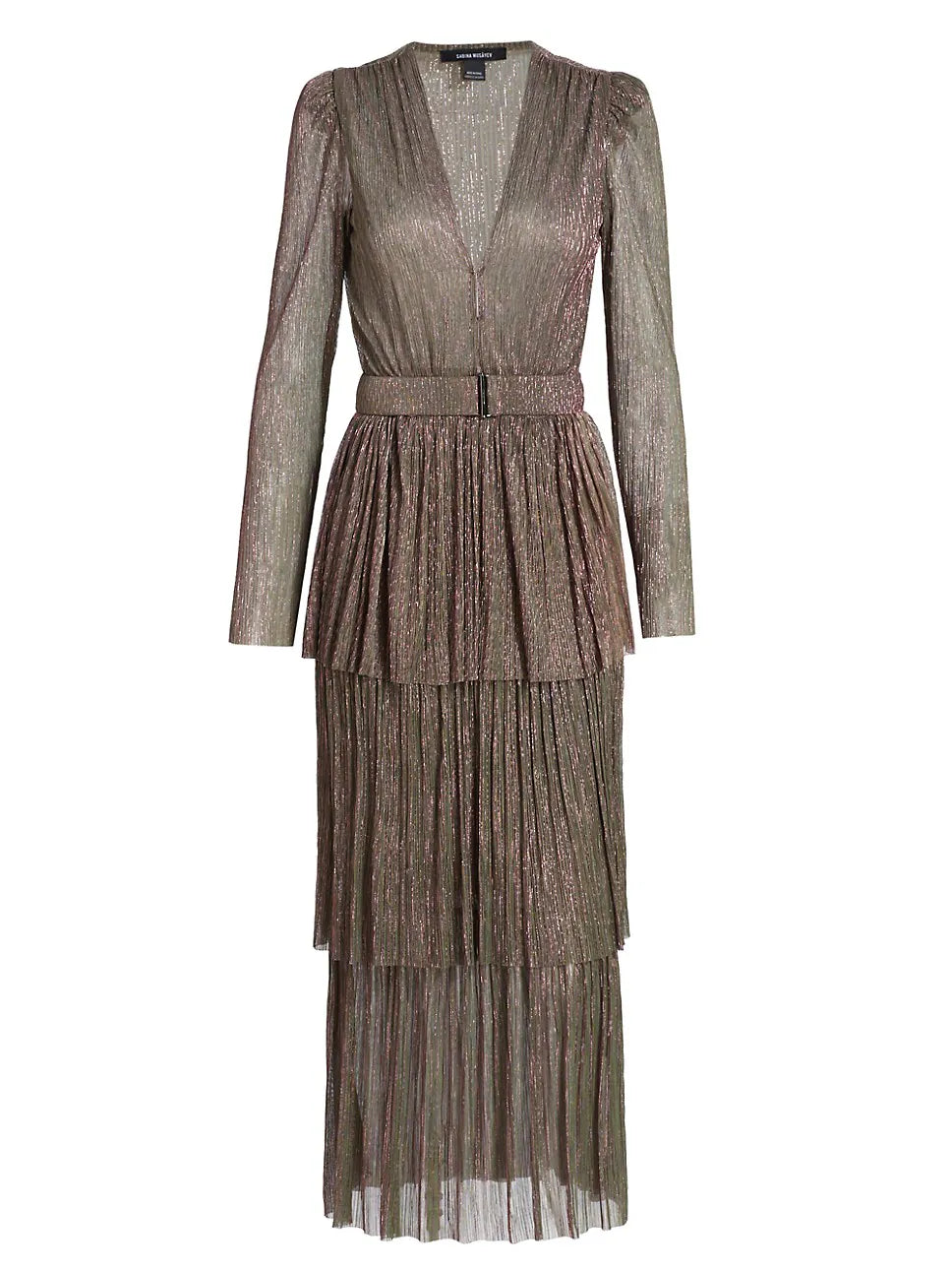 Boasting a pleated metallic outer, Sabina Musáyev's long-sleeve Carry dress is detailed with a tonal buckled belt and tiered skirt.