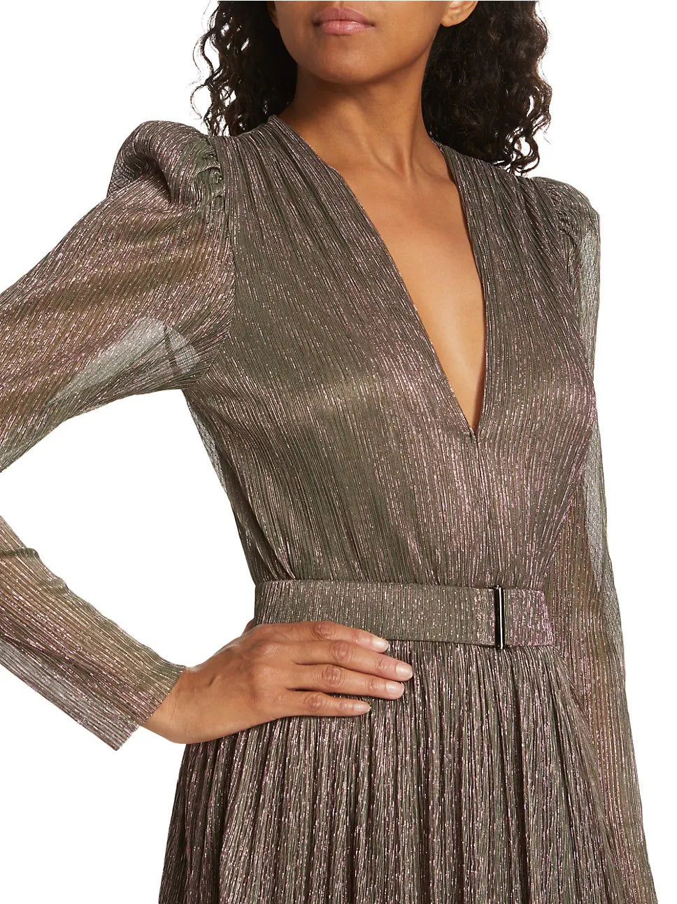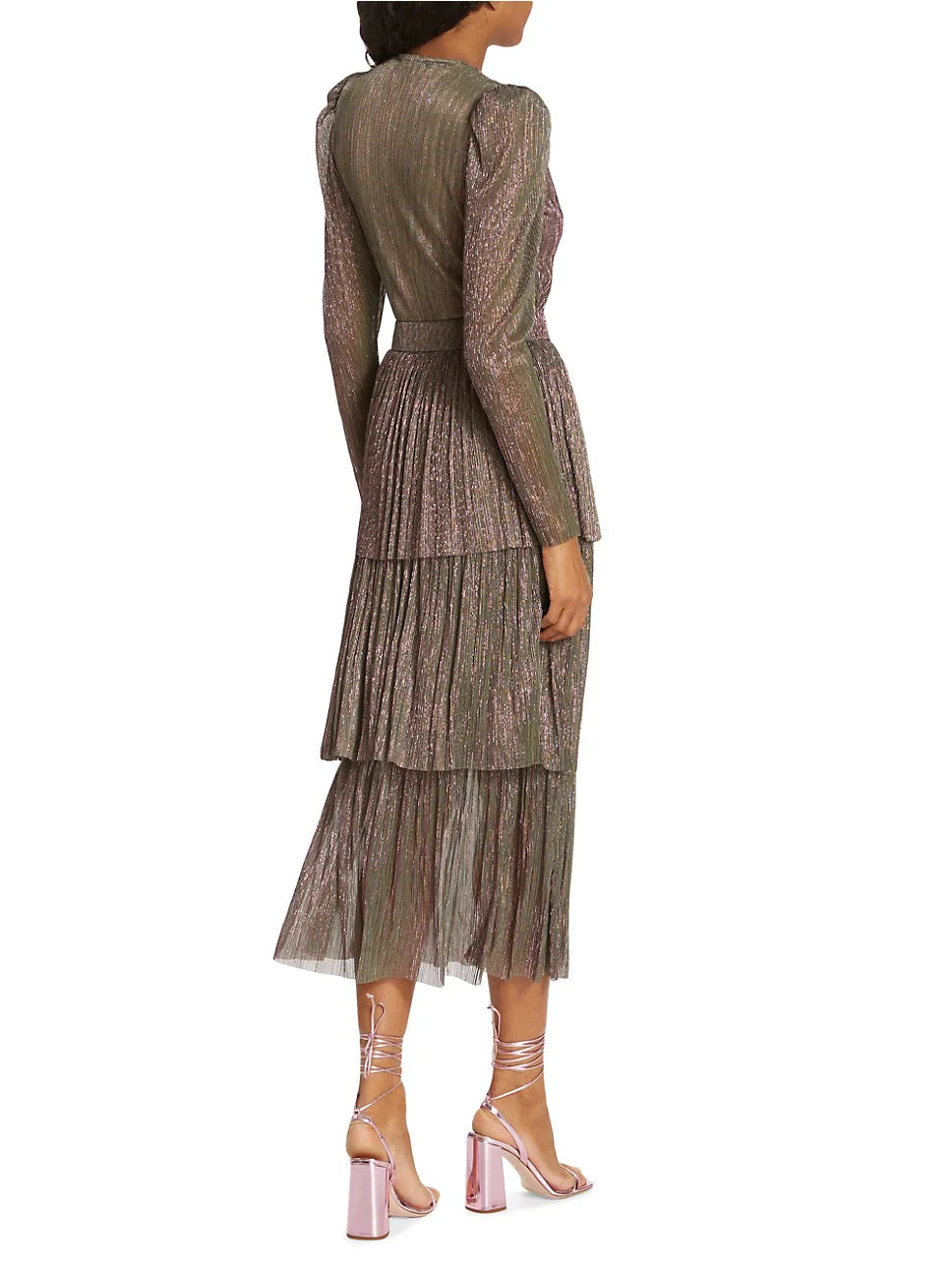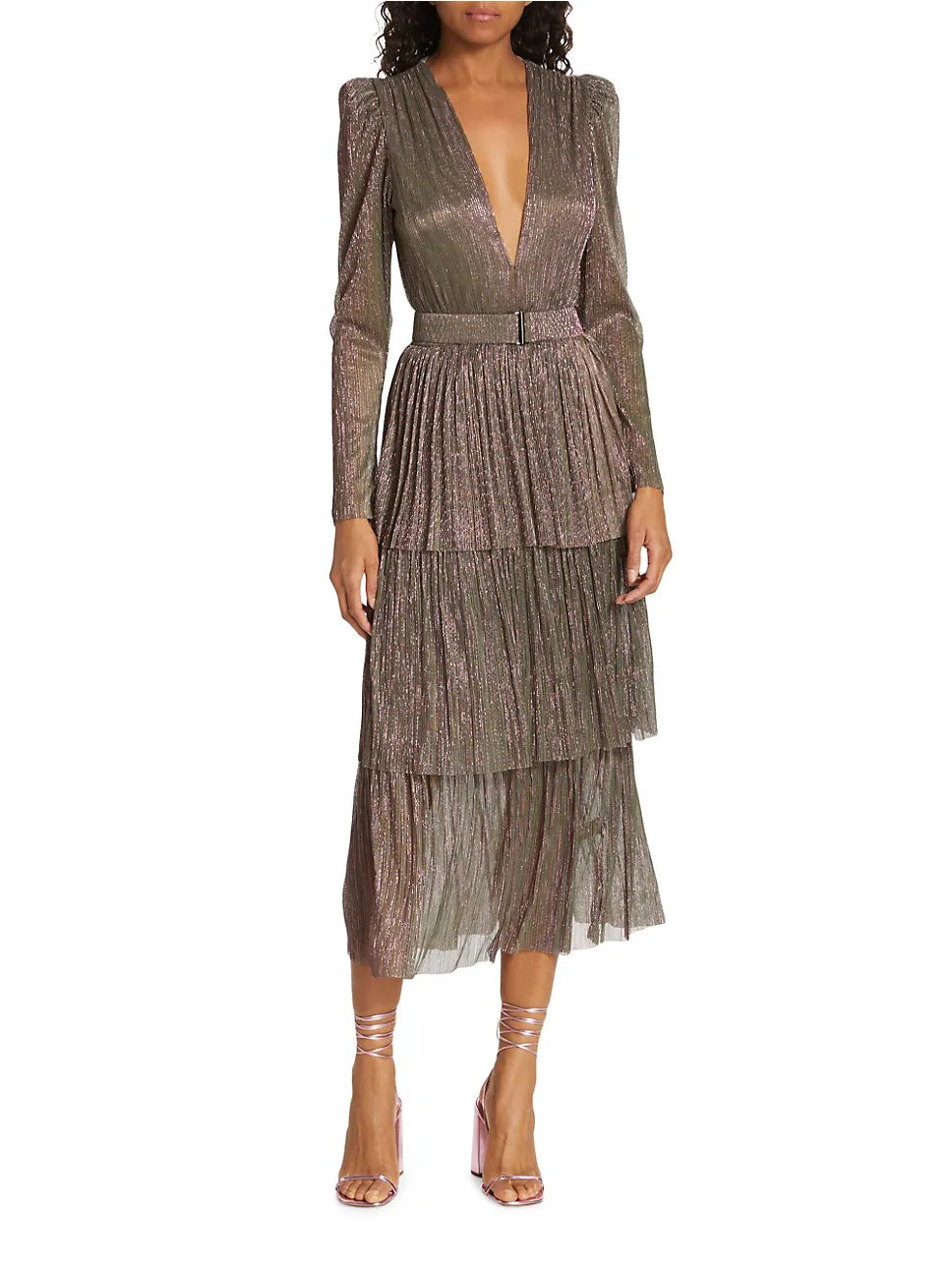 Boasting a pleated metallic outer, Sabina Musáyev's long-sleeve Carry dress is detailed with a tonal buckled belt and tiered skirt.