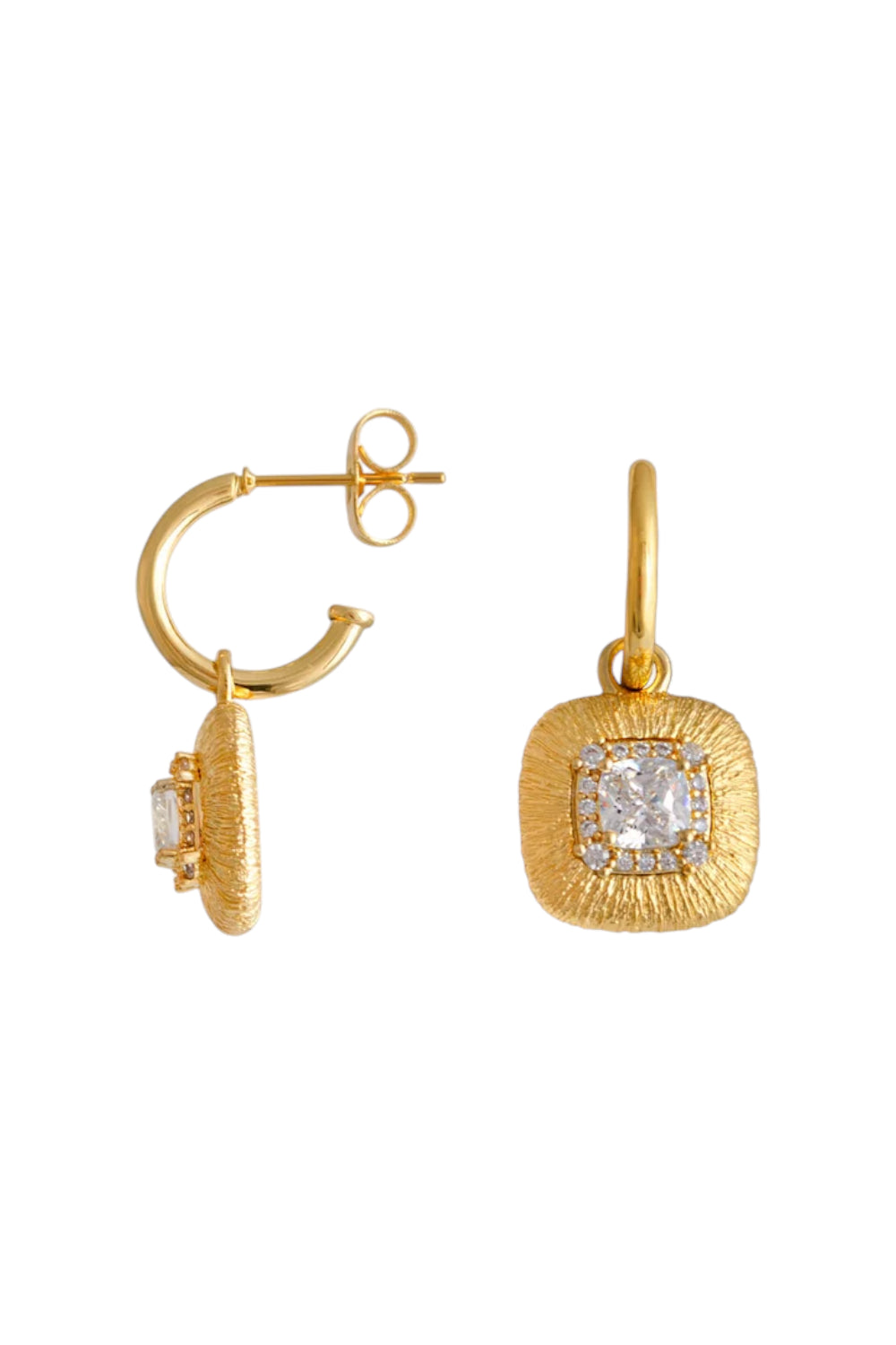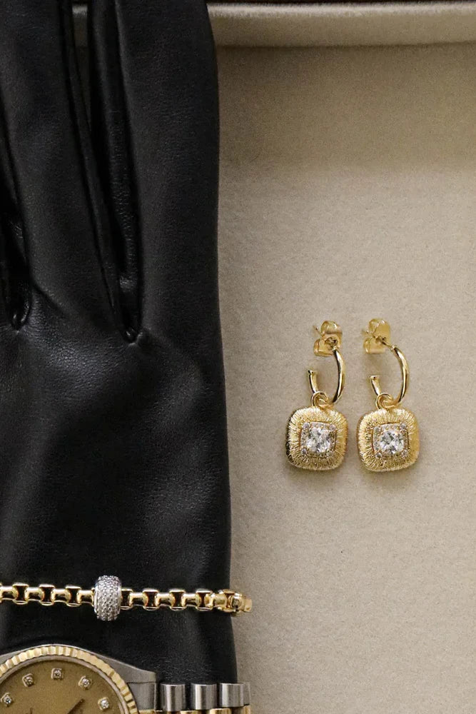 The Christina Earrings by Zahar feature a textured gold drop with a cushion-cut cubic zirconia centre, surrounded by delicate pavé detailing. Timeless and elegant, they’re perfect for special occasions or everyday luxury.