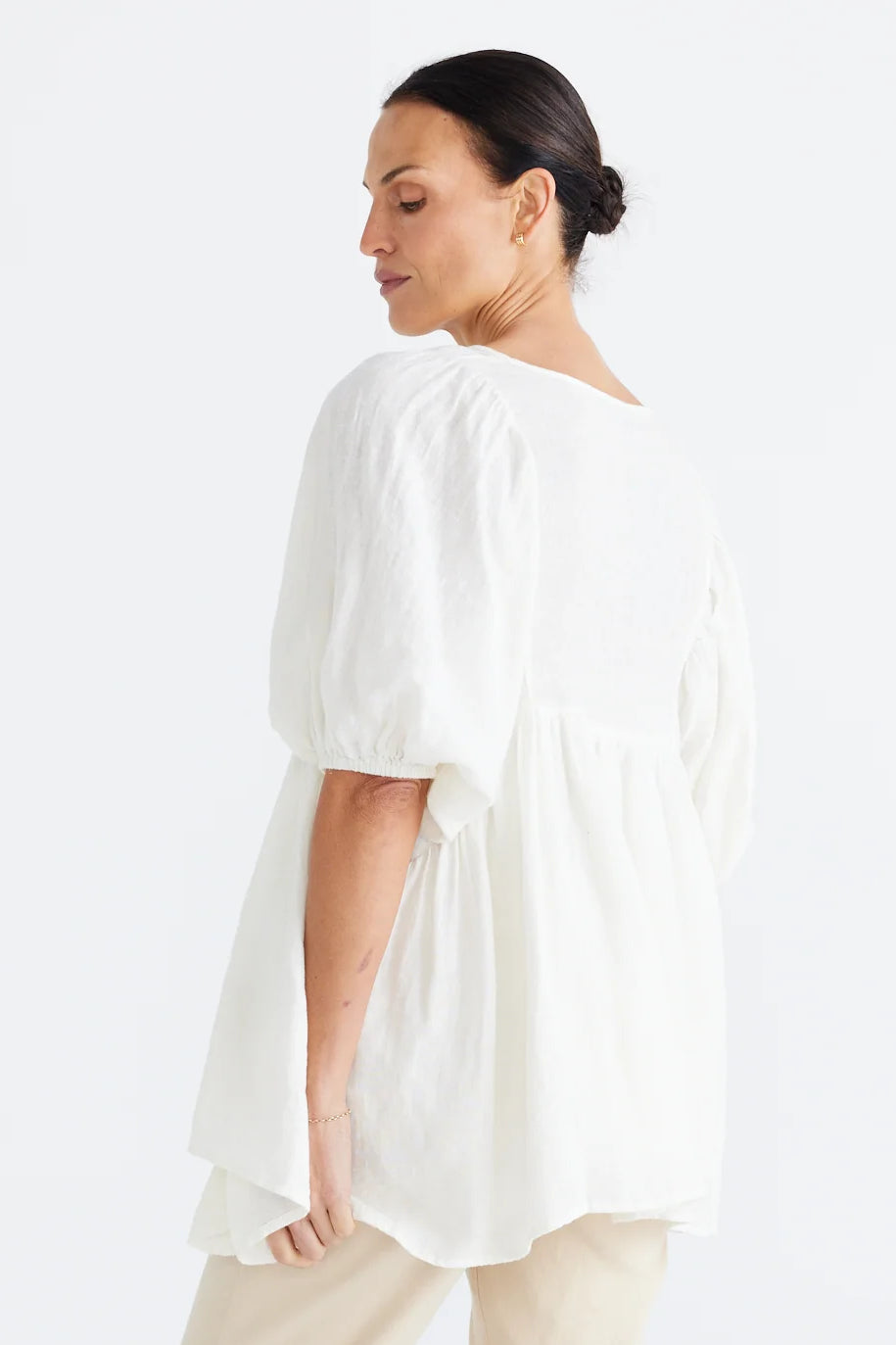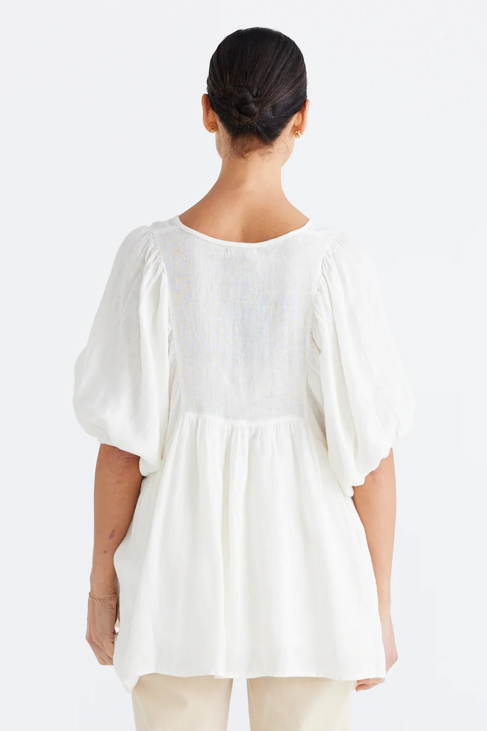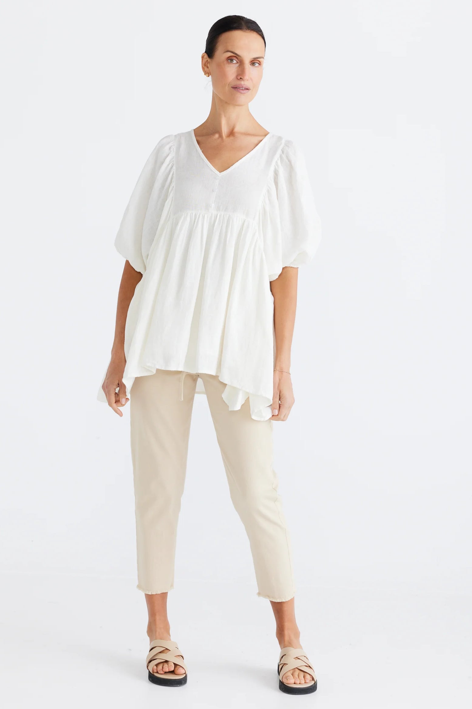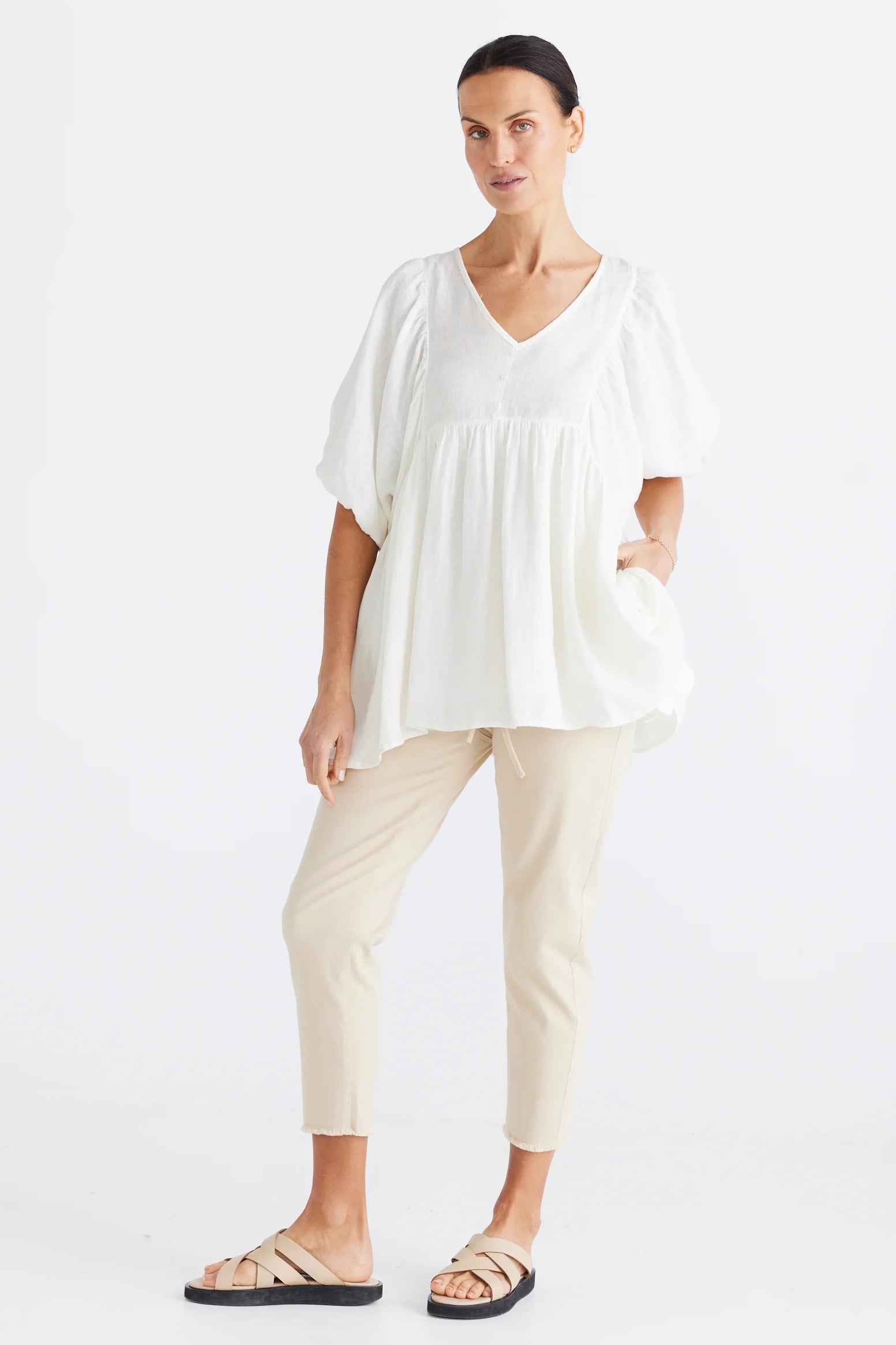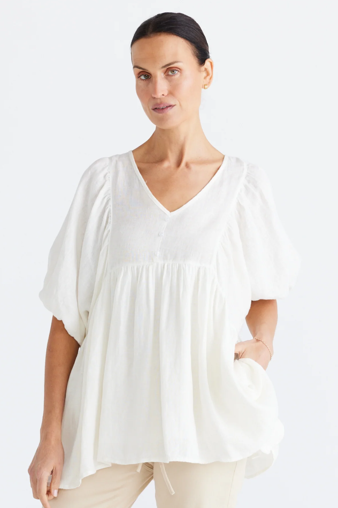 The Ciao Bella Top by Brave + True is relaxed and easy style top. Featuring a flattering V neck and balloon sleeves, it looks fresh and neat back with denim and white pants. Also Available in Apple and Denim.