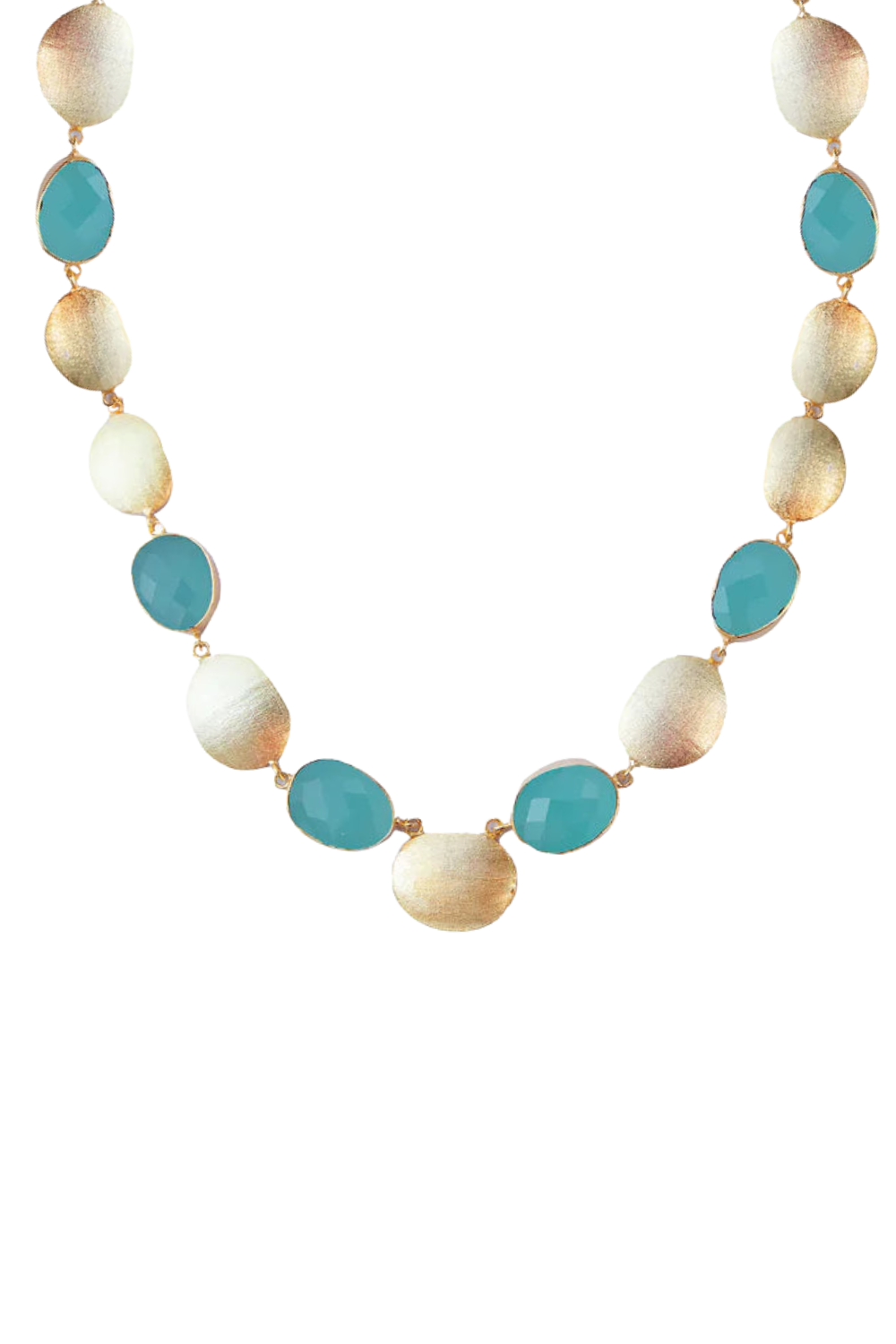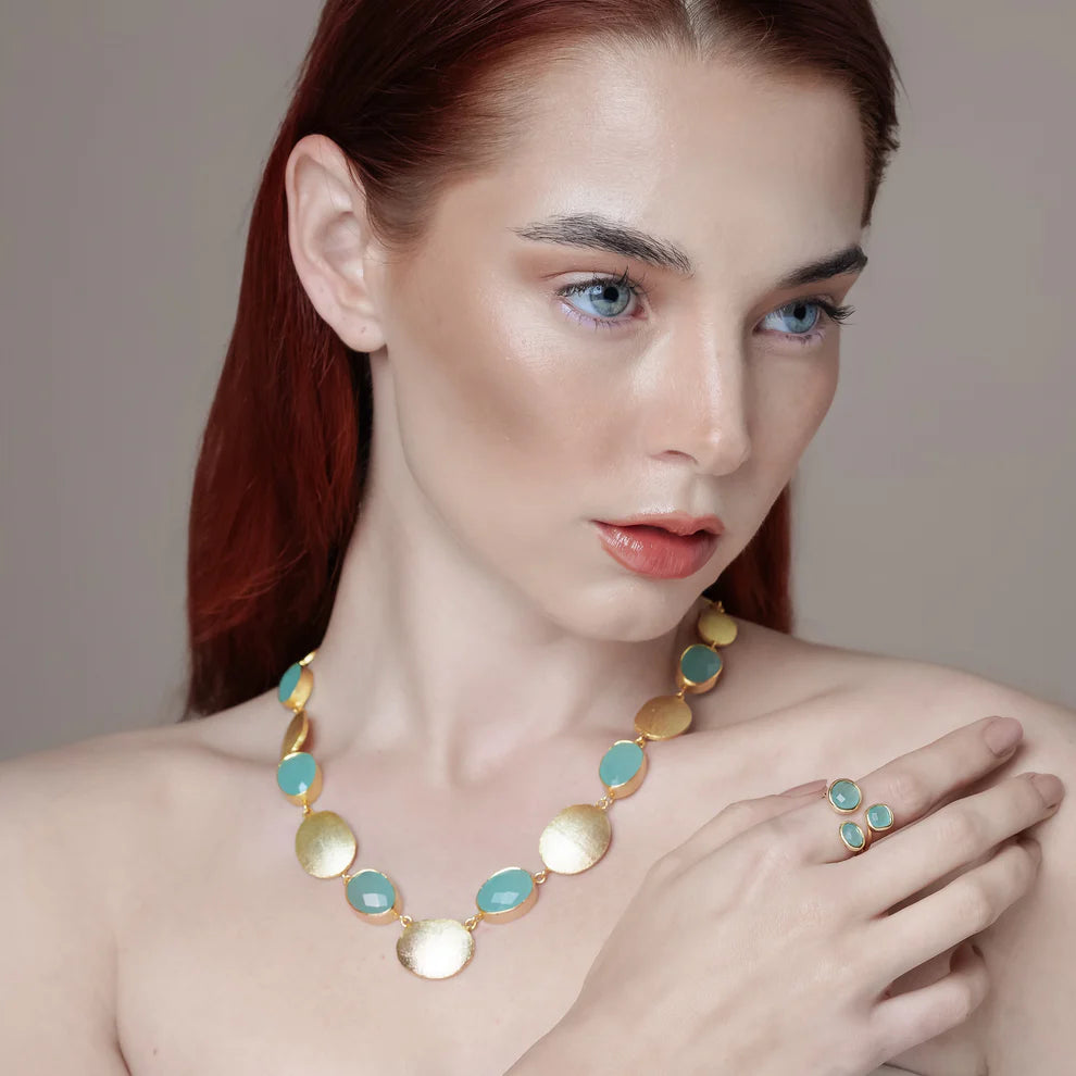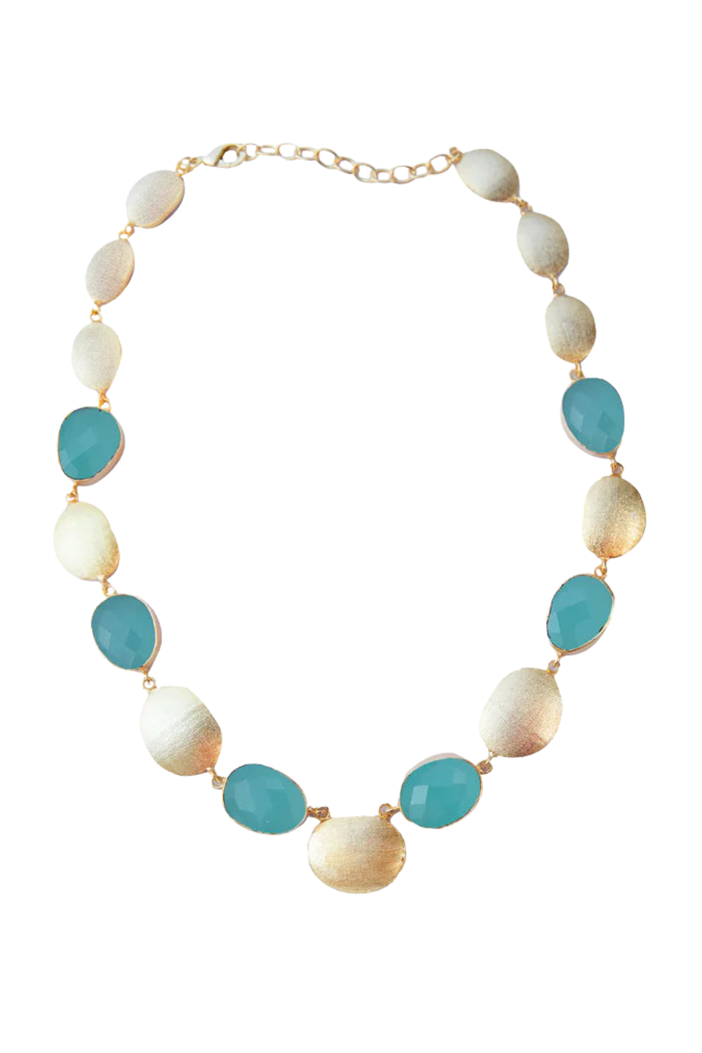 Discover our exquisite Dako Brass Necklace in Aqua chalcedony, a breathtaking and handcrafted creation. This stunning, artisanal piece combines the two elements for a unique and beautiful look.