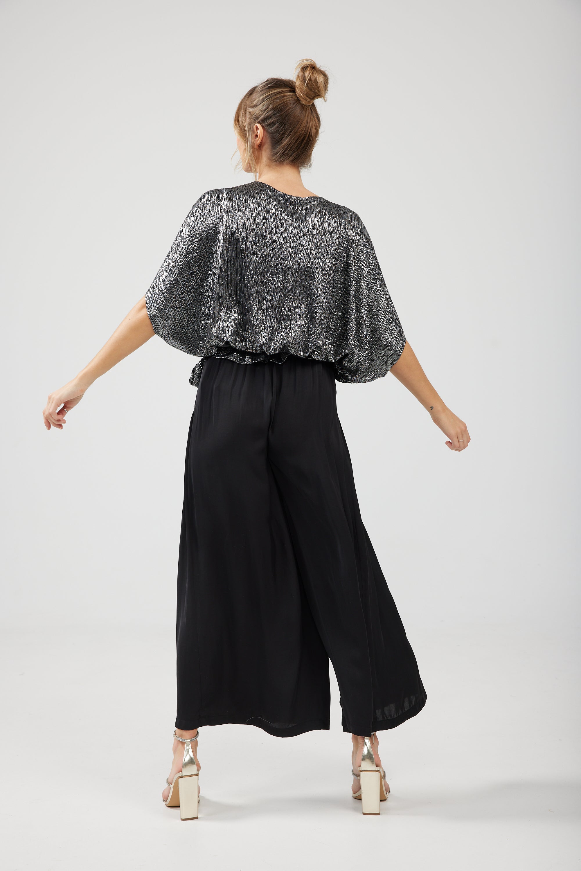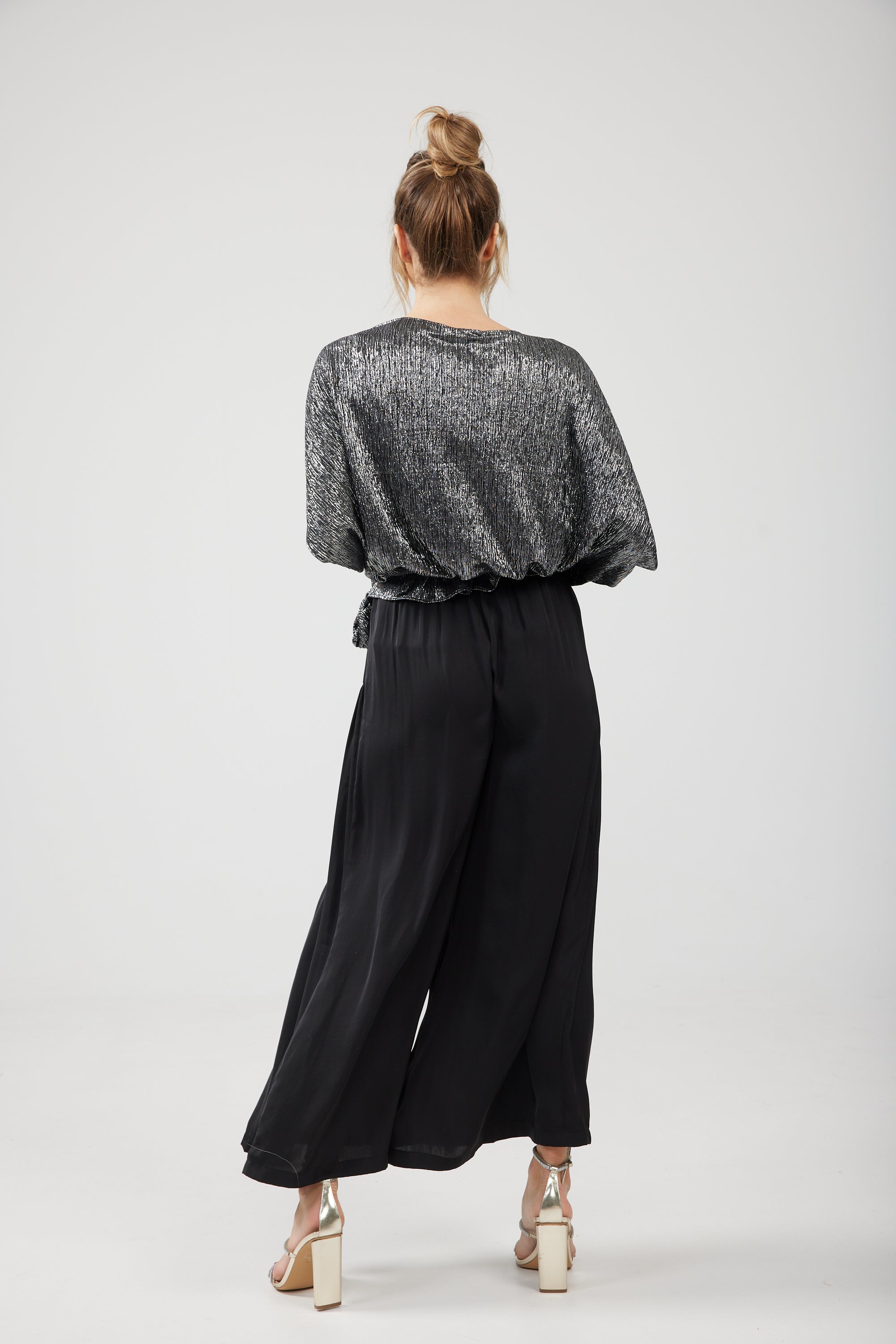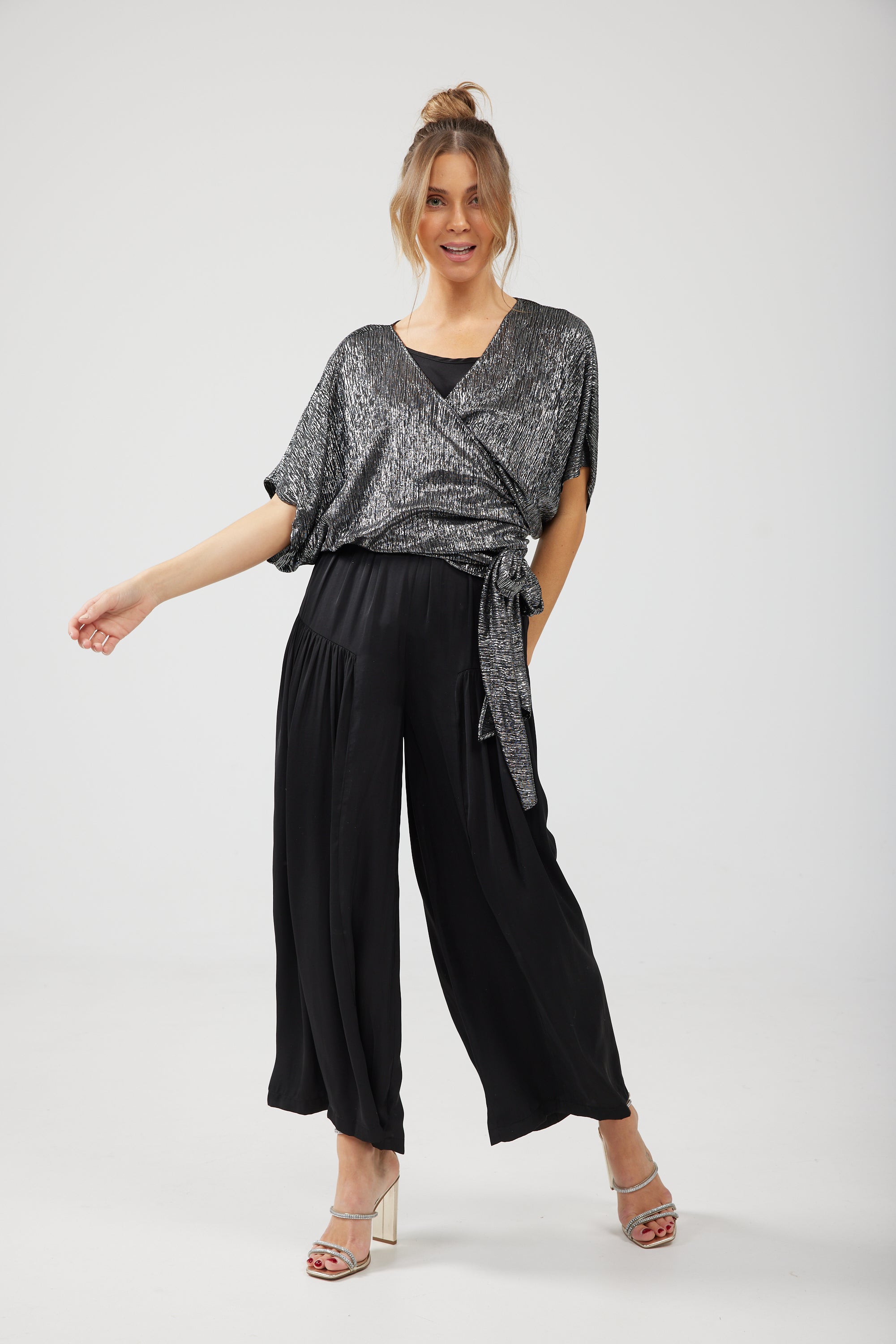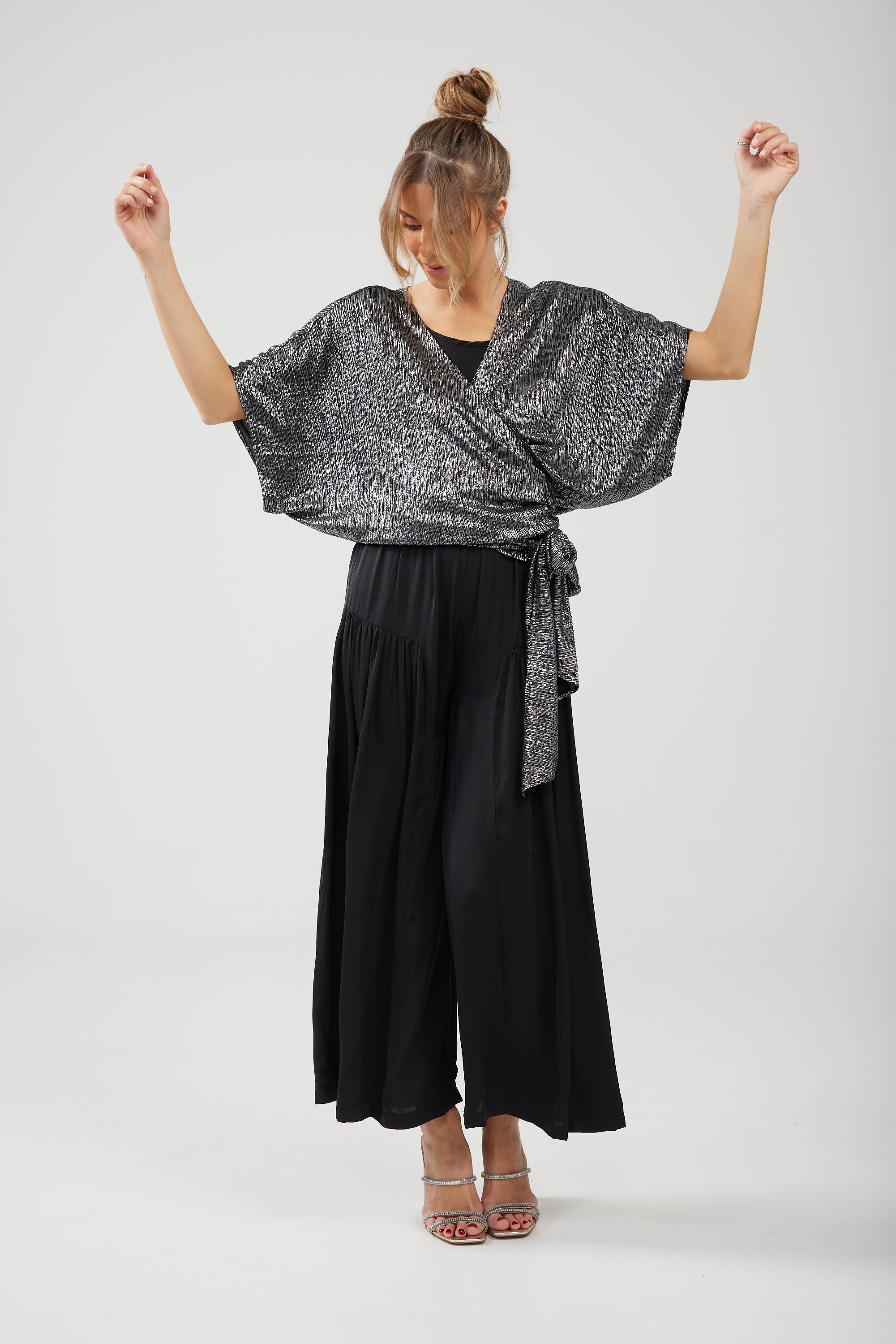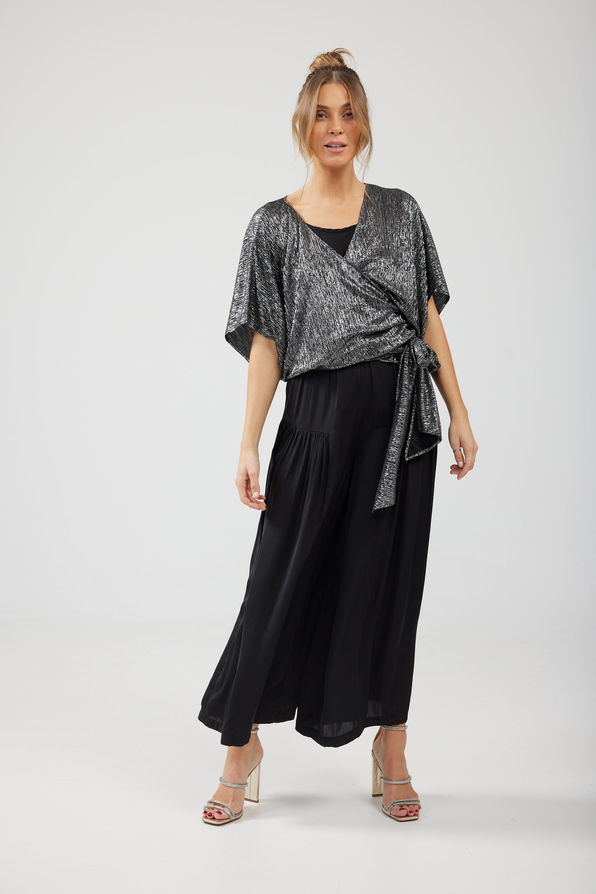 Constructed from a metallic crinkle fabric with a gorgeous drape and lusturous finish, the Destiny Wrap Top features a tie-up wrap front and floaty batwing sleeves. This one-sized throwover is versatile in the way it's worn. Wrap it at the front and secure it at the back, or simply throw it on over a basic cami and knot it in a statement bow.