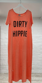 Our Dirty Hippie Dress features a vintage tangerine t-shirt dress with short sleeves, splatter paint, and slight distressing.