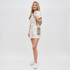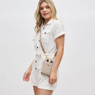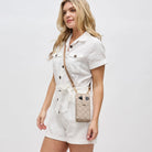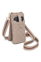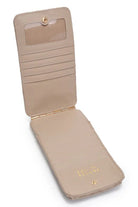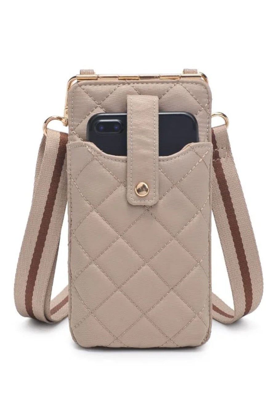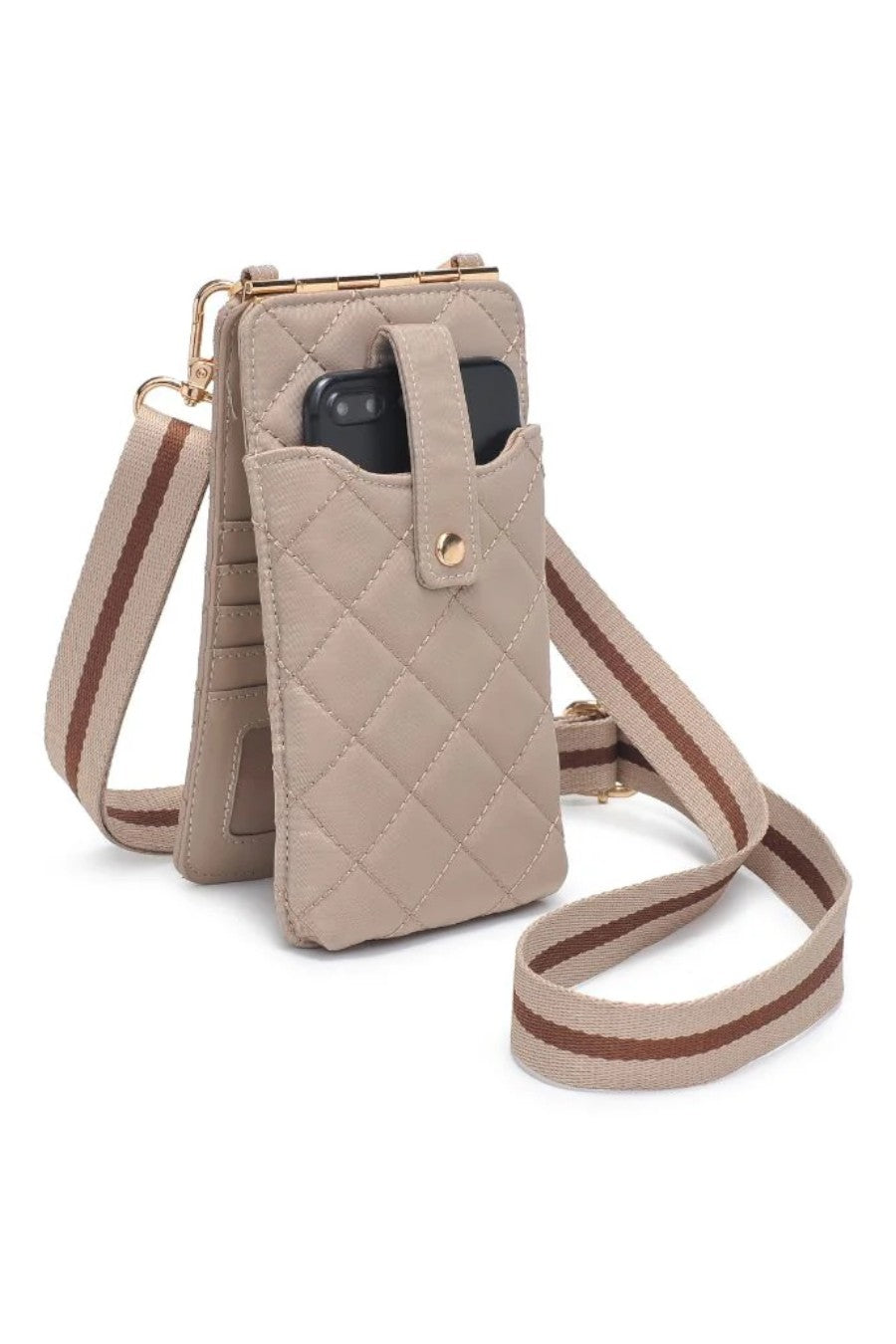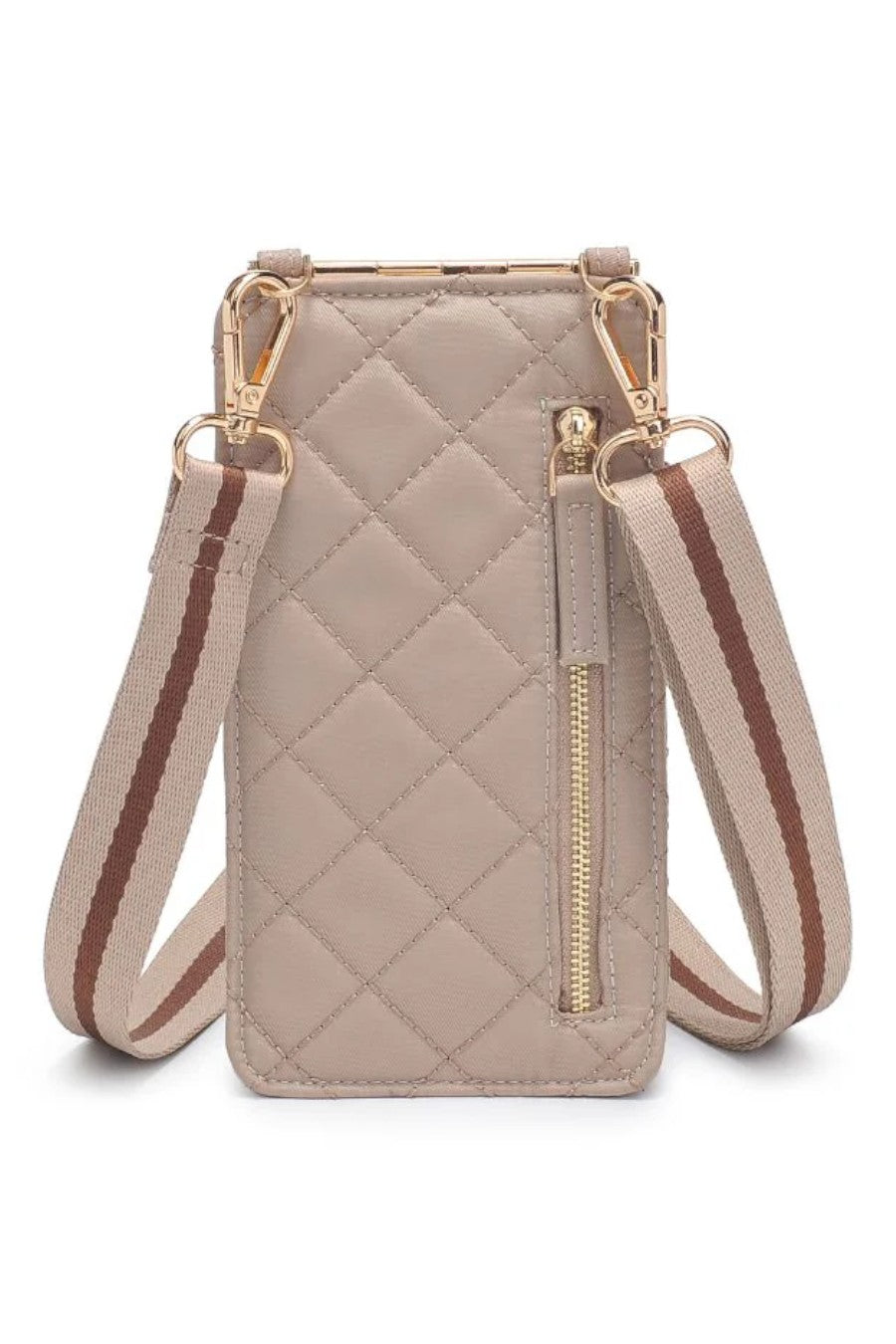 - Exterior Details: Smartphone snap pocket, back zip pocket, gold hardware details