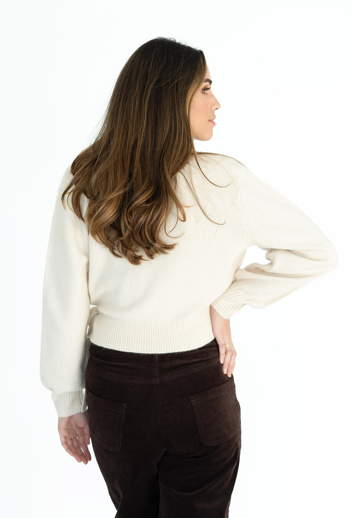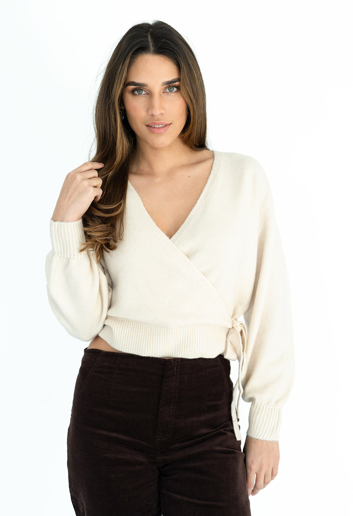 Wrap yourself in this soft angora blend. This elegant ballet-style top, features a cross-over design tied to the left with the inner wrap attached at the side seam for a secure fit. The cropped length falls at the natural waistline.