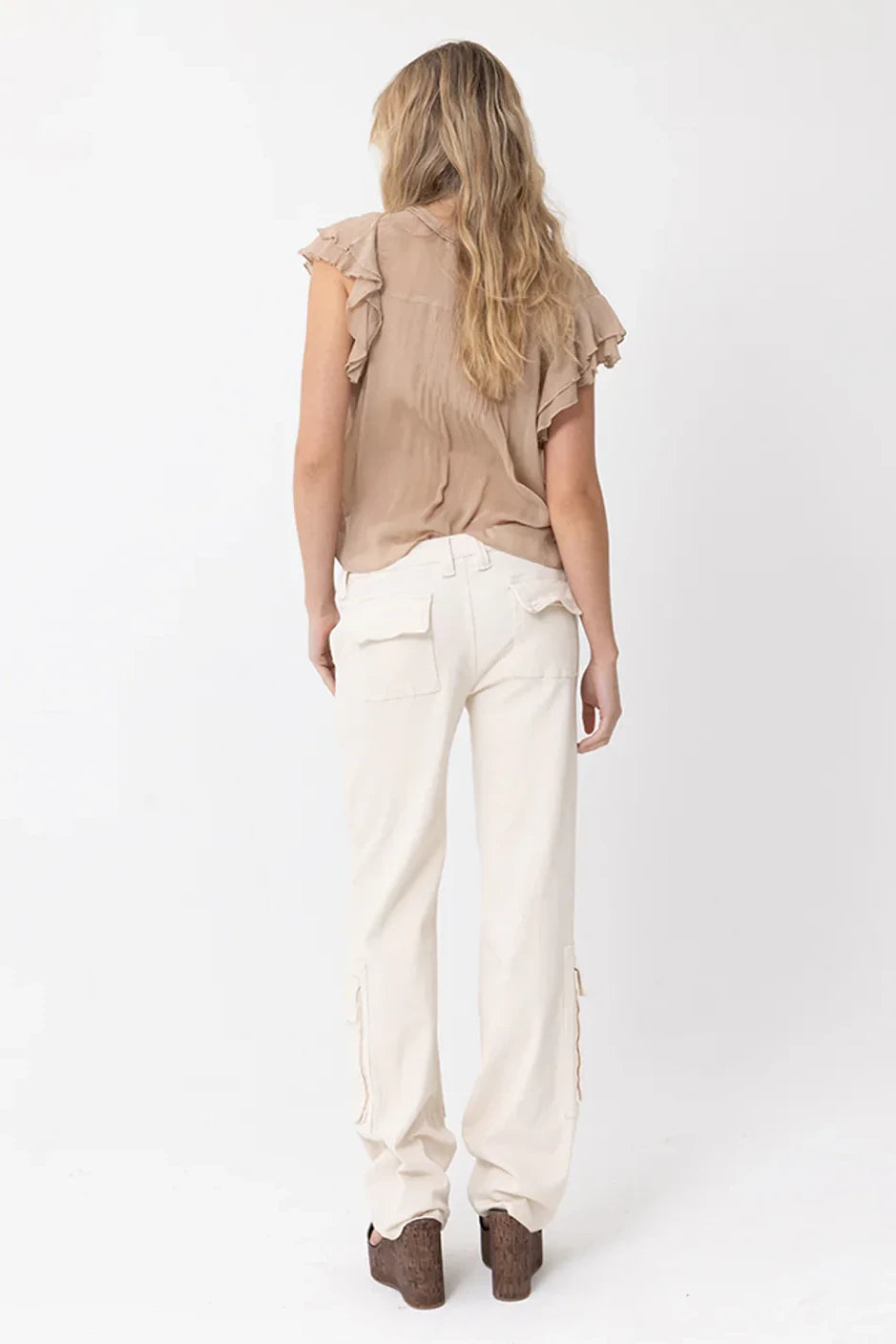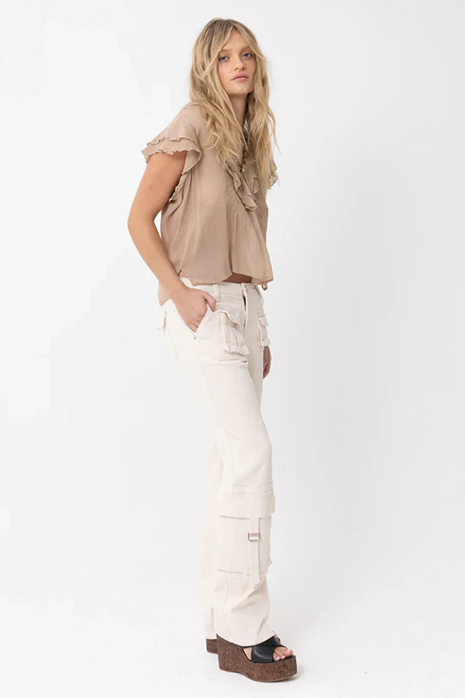 The Enchanted Short Sleeve Blouse in Mocha by Joey The Label is a dreamy, floaty piece designed to captivate. Crafted from luxurious crinkle viscose, it offers the breathability and elegance of silk without the hassle of dry cleaning. Soft layered ruffles extend 4 to 5cm from the shoulder, softening the upper arm, while the button-through neckline features delicate pin tucks, pleating, and romantic ruffles—reminiscent of recent styles seen at Paris Fashion Week.