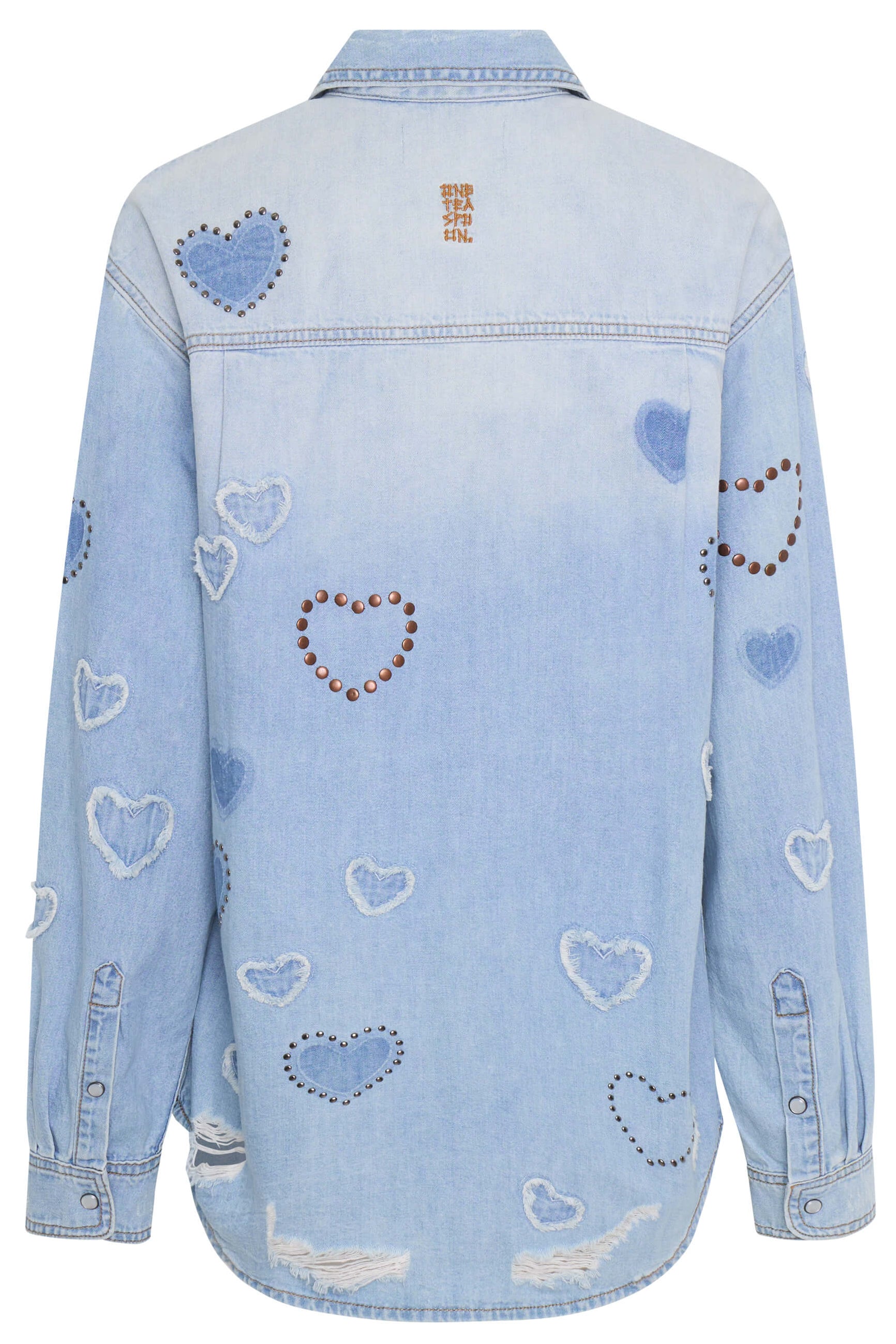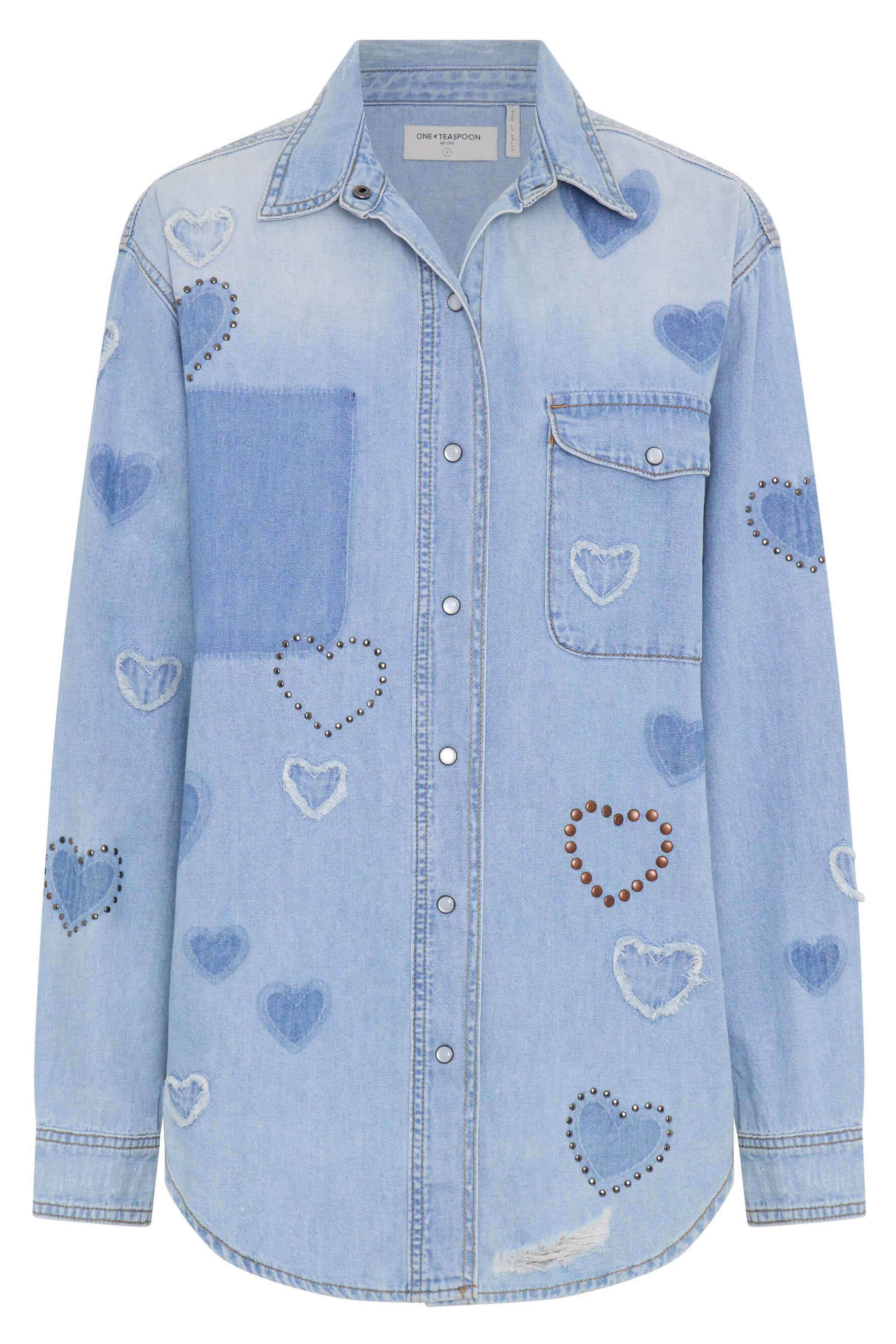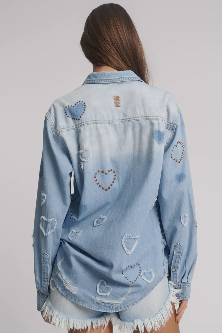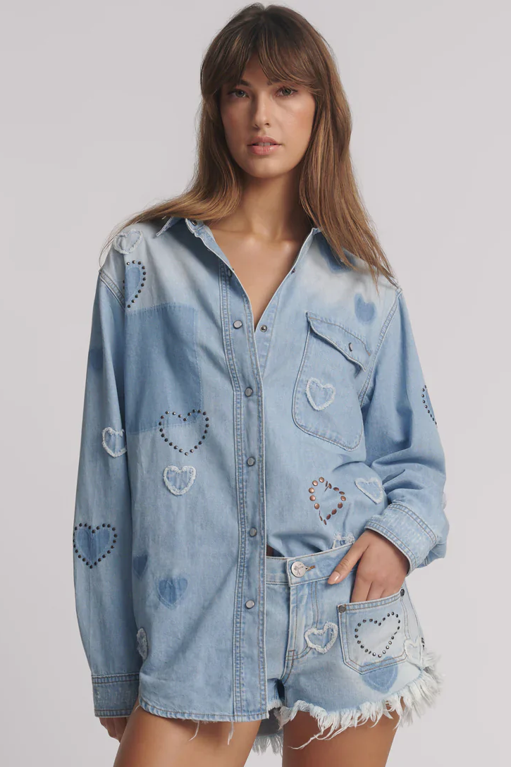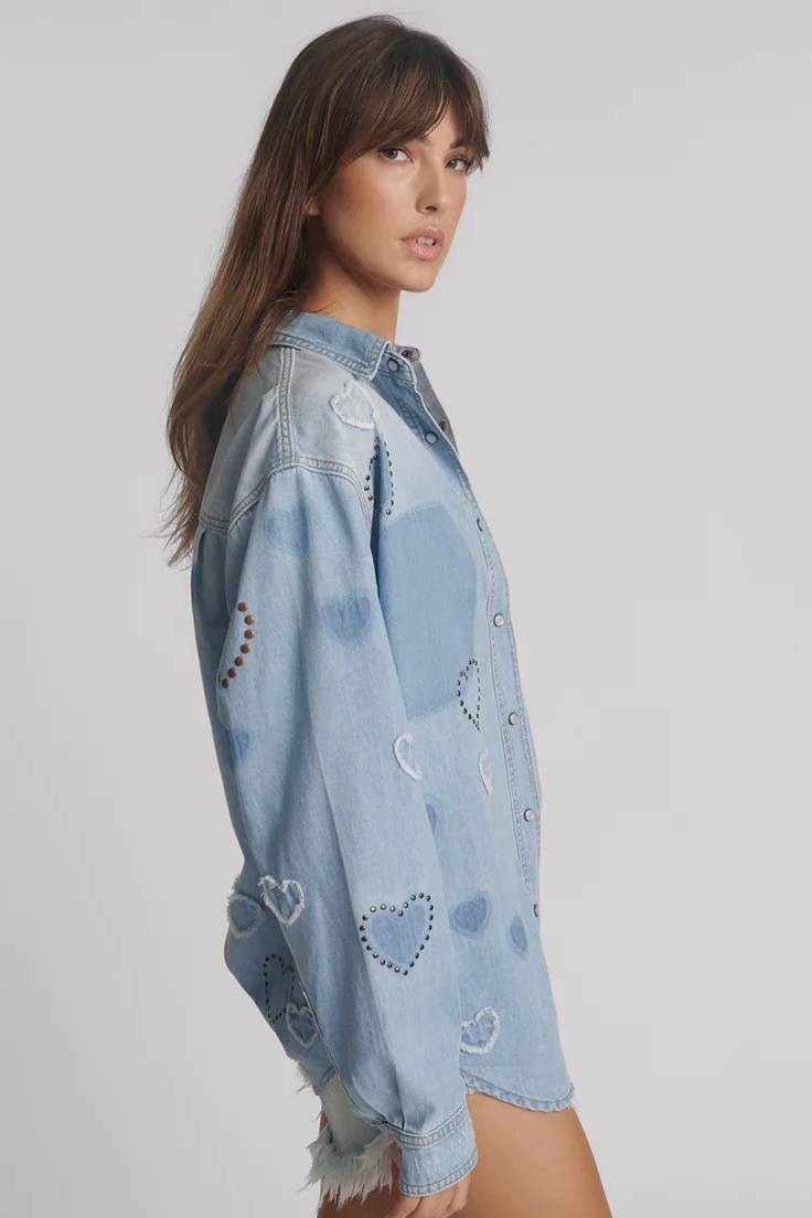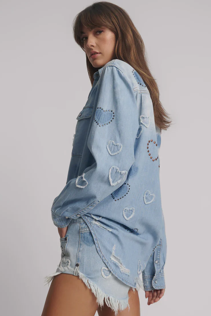 The STUDDED BLUE HEART EVERYDAY DENIM SHIRT is a slightly oversized man-style denim shirt with a feminine edge. Versatile as anything, it's a new standard of comfy-grunge-cool.
