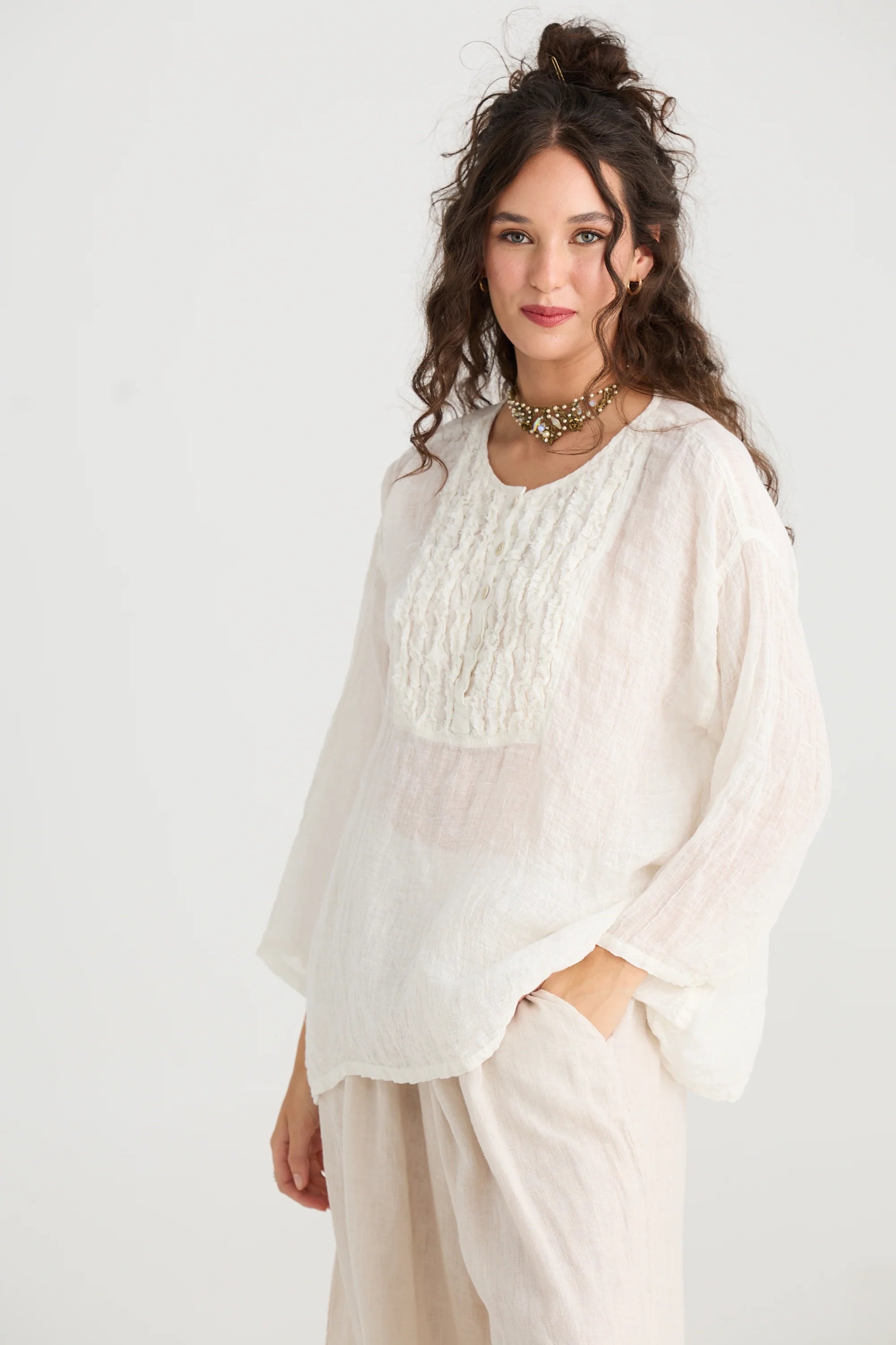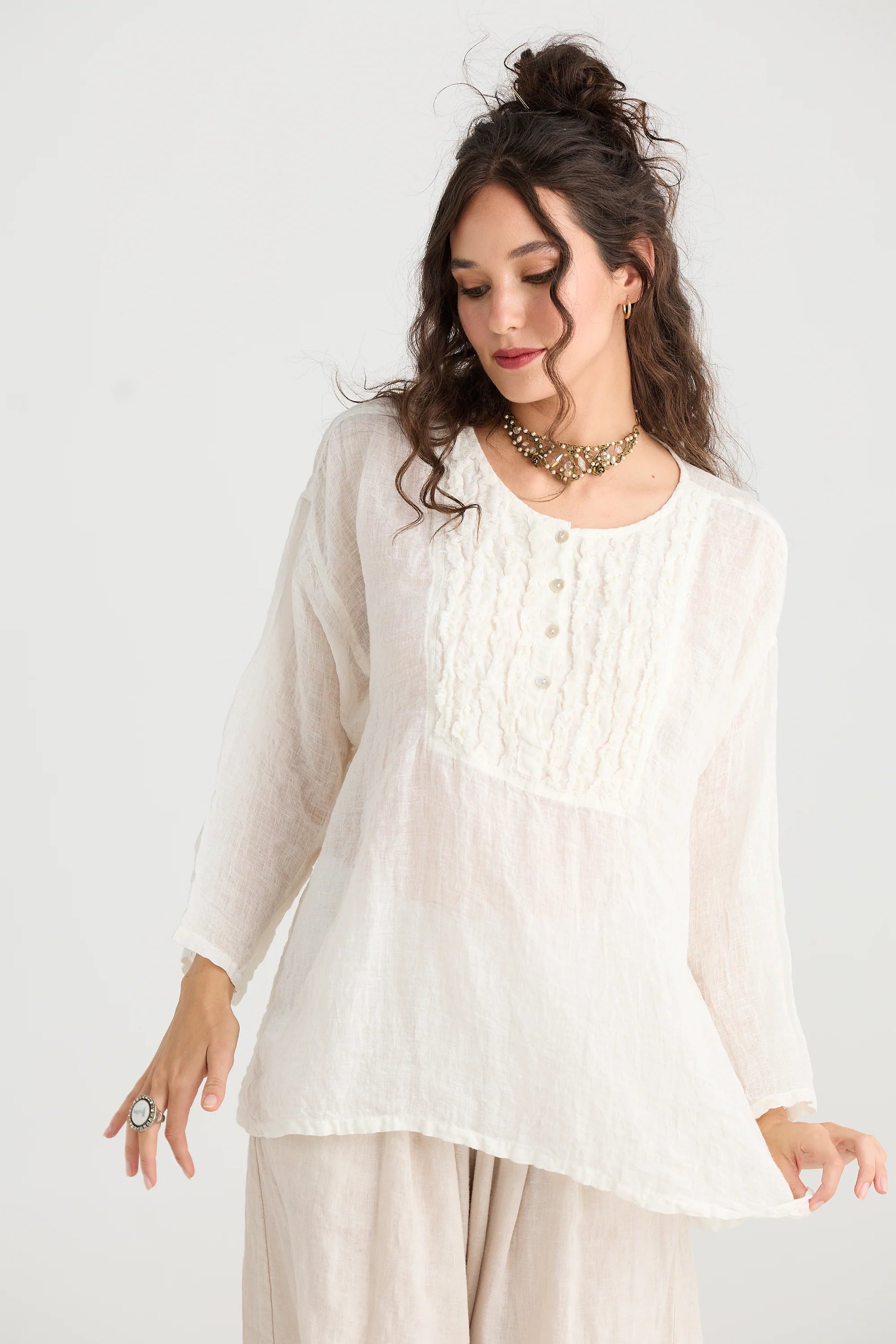 Florian is made from the most wonderful soft textured linen gauze and has a bodice detail of tattered small ruffles cascading down the bib front. With its Mother of Pearl buttons and exquisite workmanship this is a classic and romantically enchanting top.