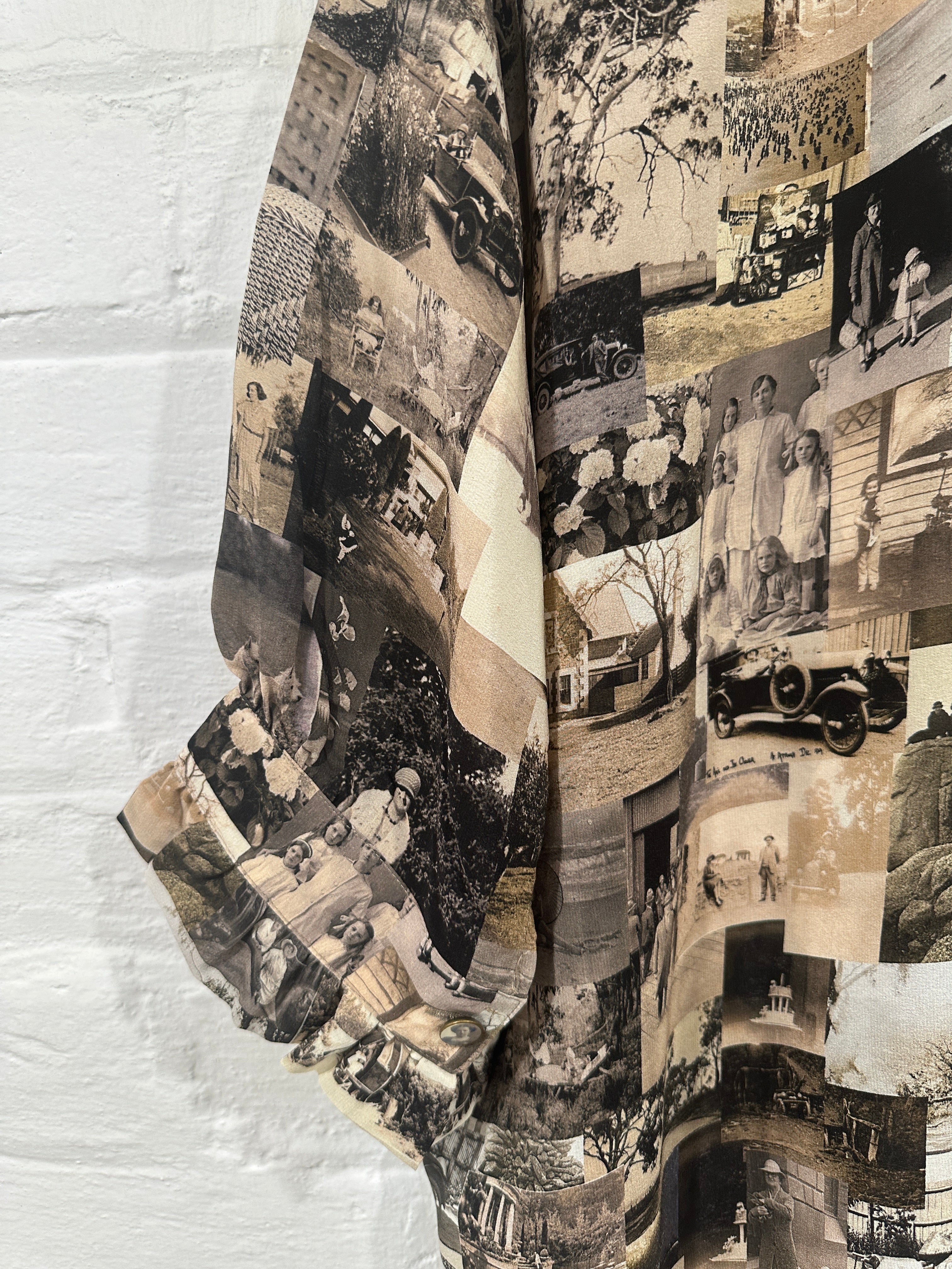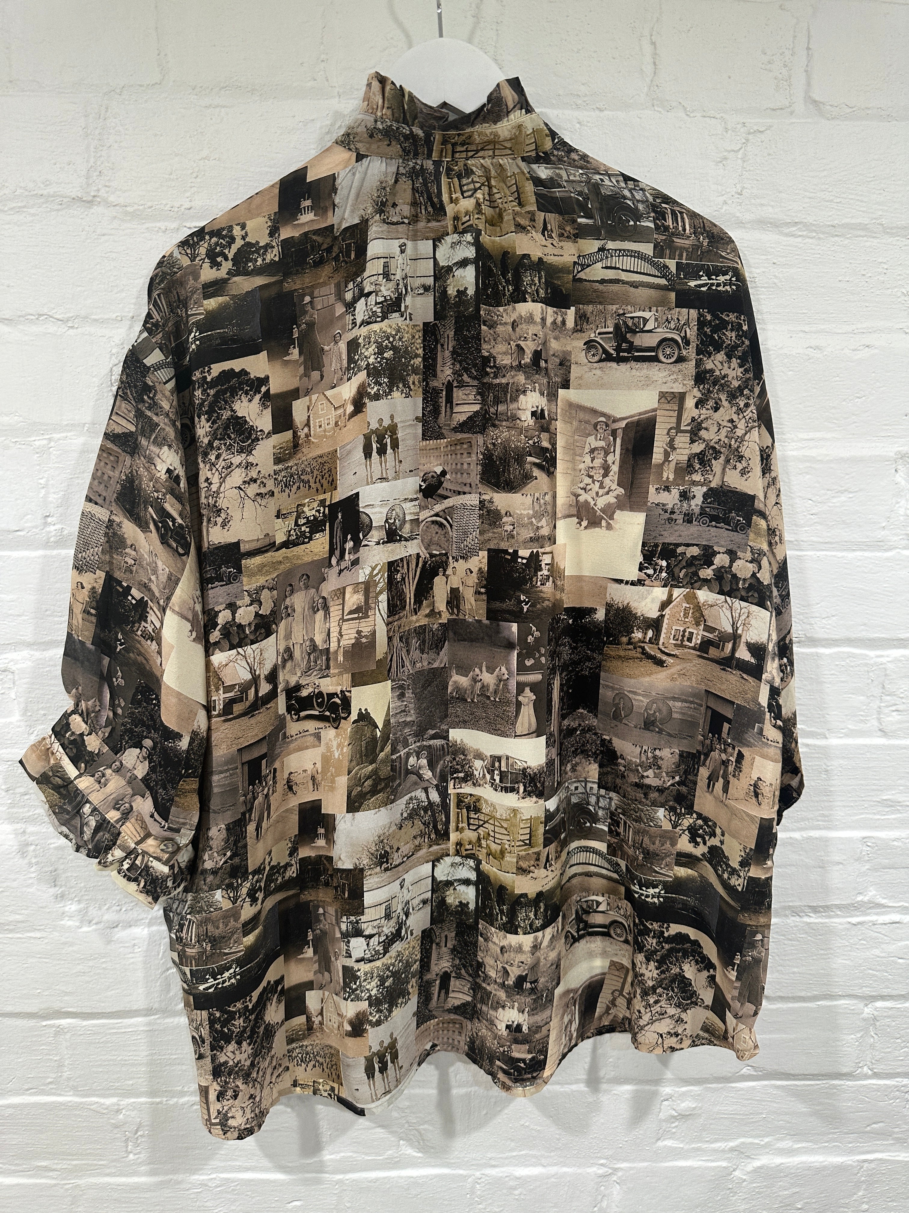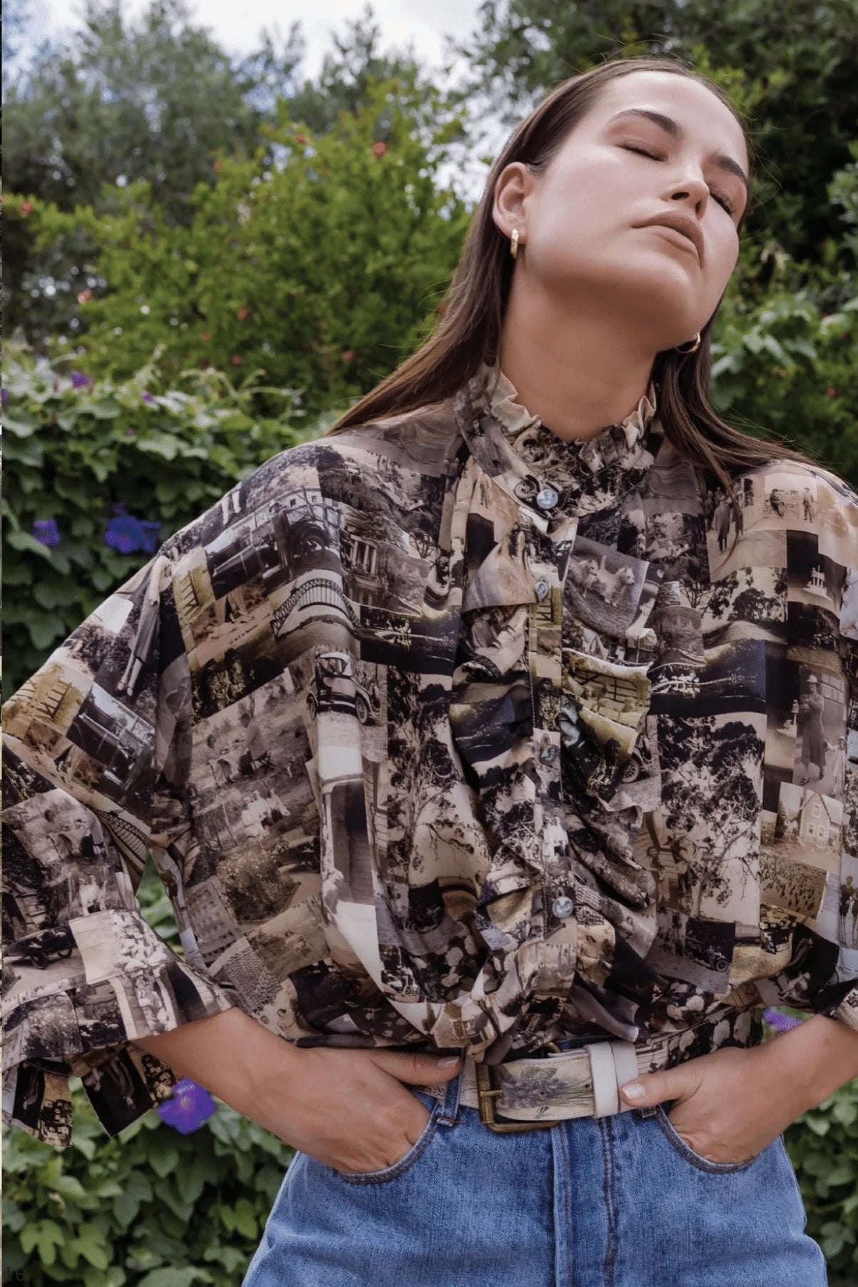 Introducing the Heirloom silk shirt by Maud Alice Dainty. With a button-up front, ruffle detail, and bespoke Maud Alice Dainty buttons, this luxurious shirt features a stand collar and ruffle cuffs. Adorned with a sepia collage of old family photos, this shirt is a timeless piece that evokes a sense of nostalgia.
