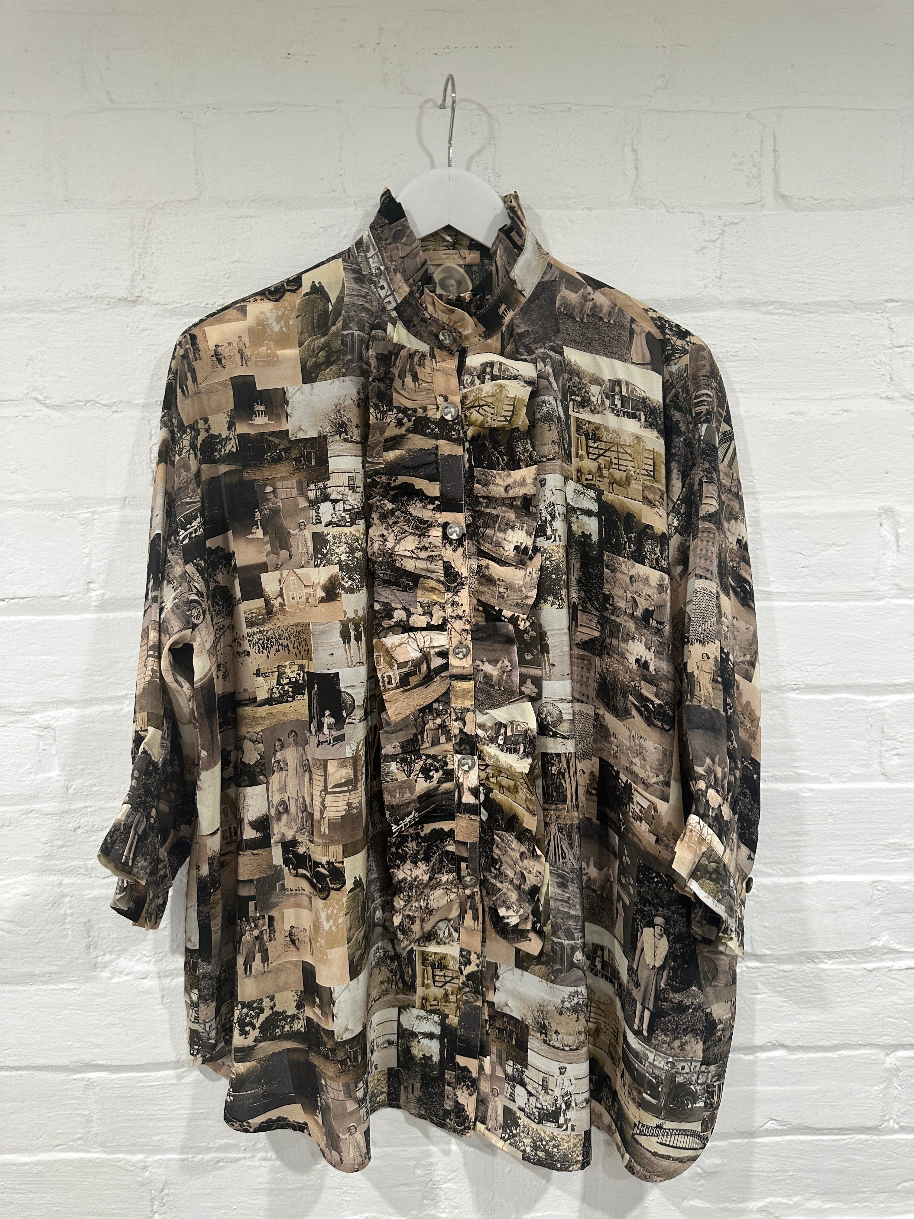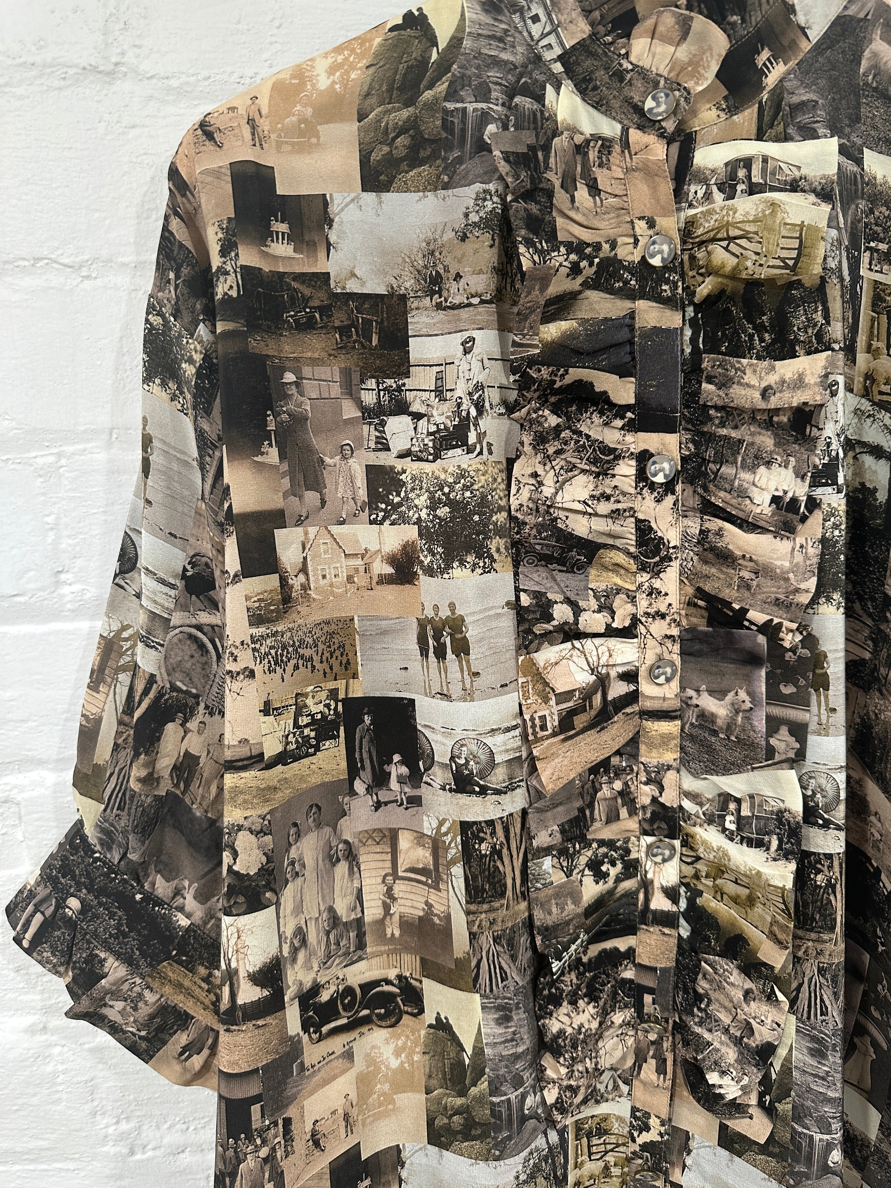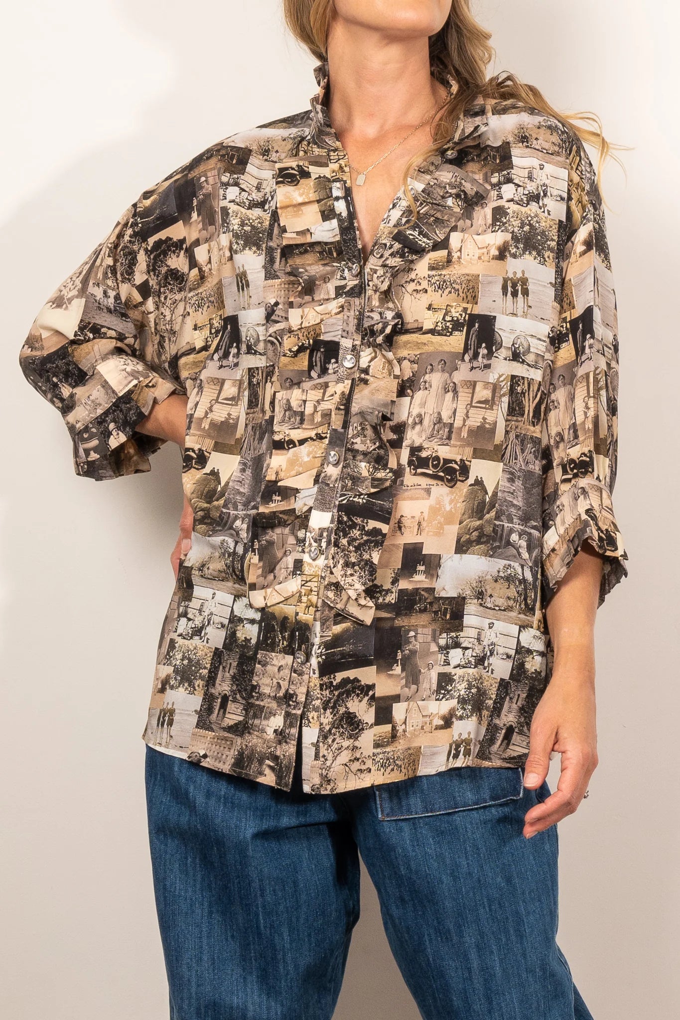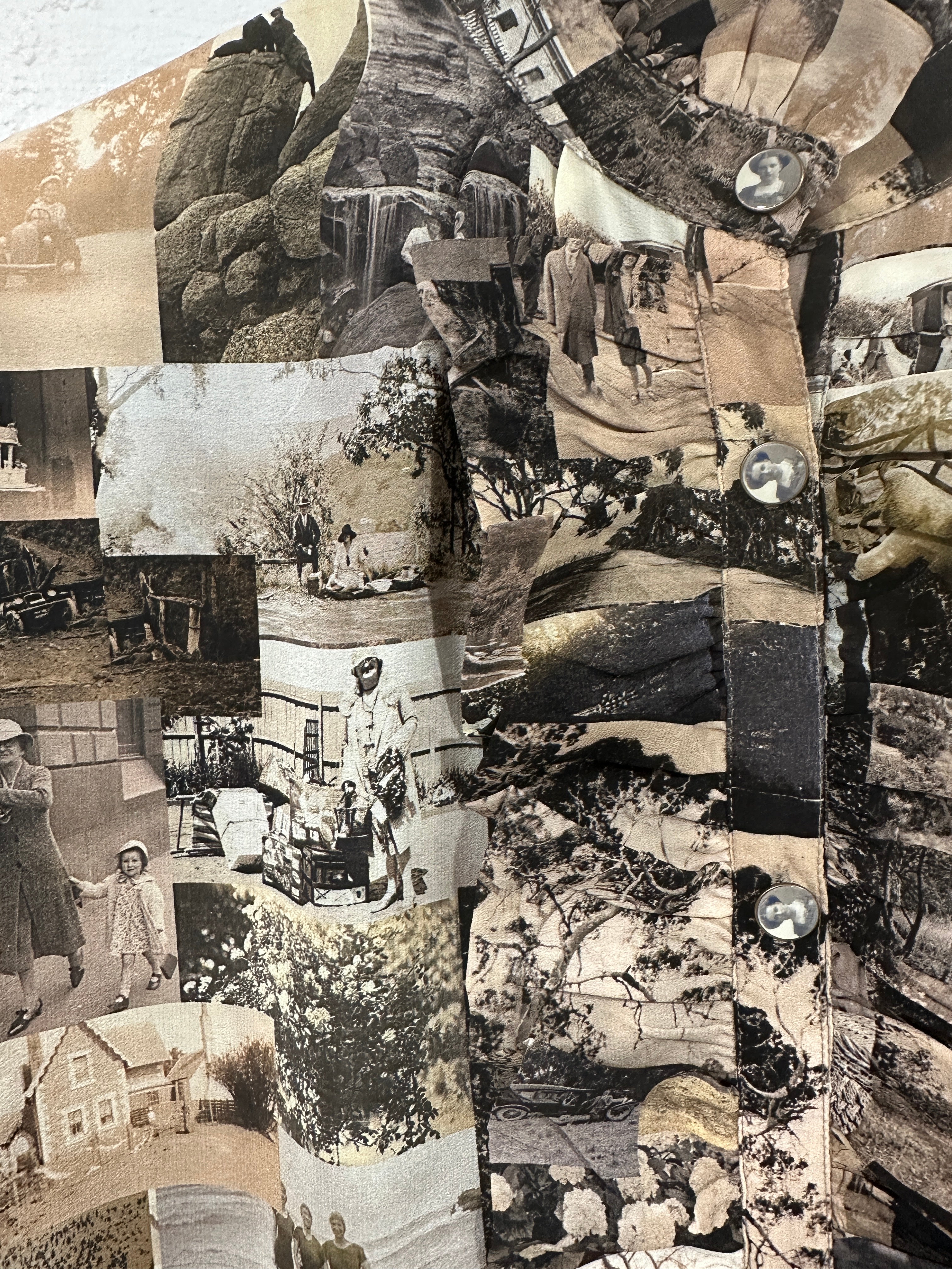 Introducing the Heirloom silk shirt by Maud Alice Dainty. With a button-up front, ruffle detail, and bespoke Maud Alice Dainty buttons, this luxurious shirt features a stand collar and ruffle cuffs. Adorned with a sepia collage of old family photos, this shirt is a timeless piece that evokes a sense of nostalgia.