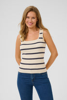 This striped tank top features a fitted silhouette, wide straps, and a square neckline. The ribbed texture and horizontal stripes lend a modern and streamlined look.