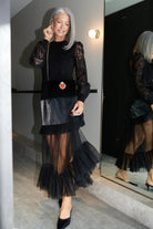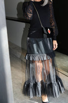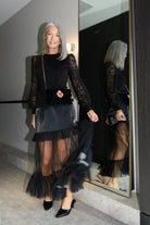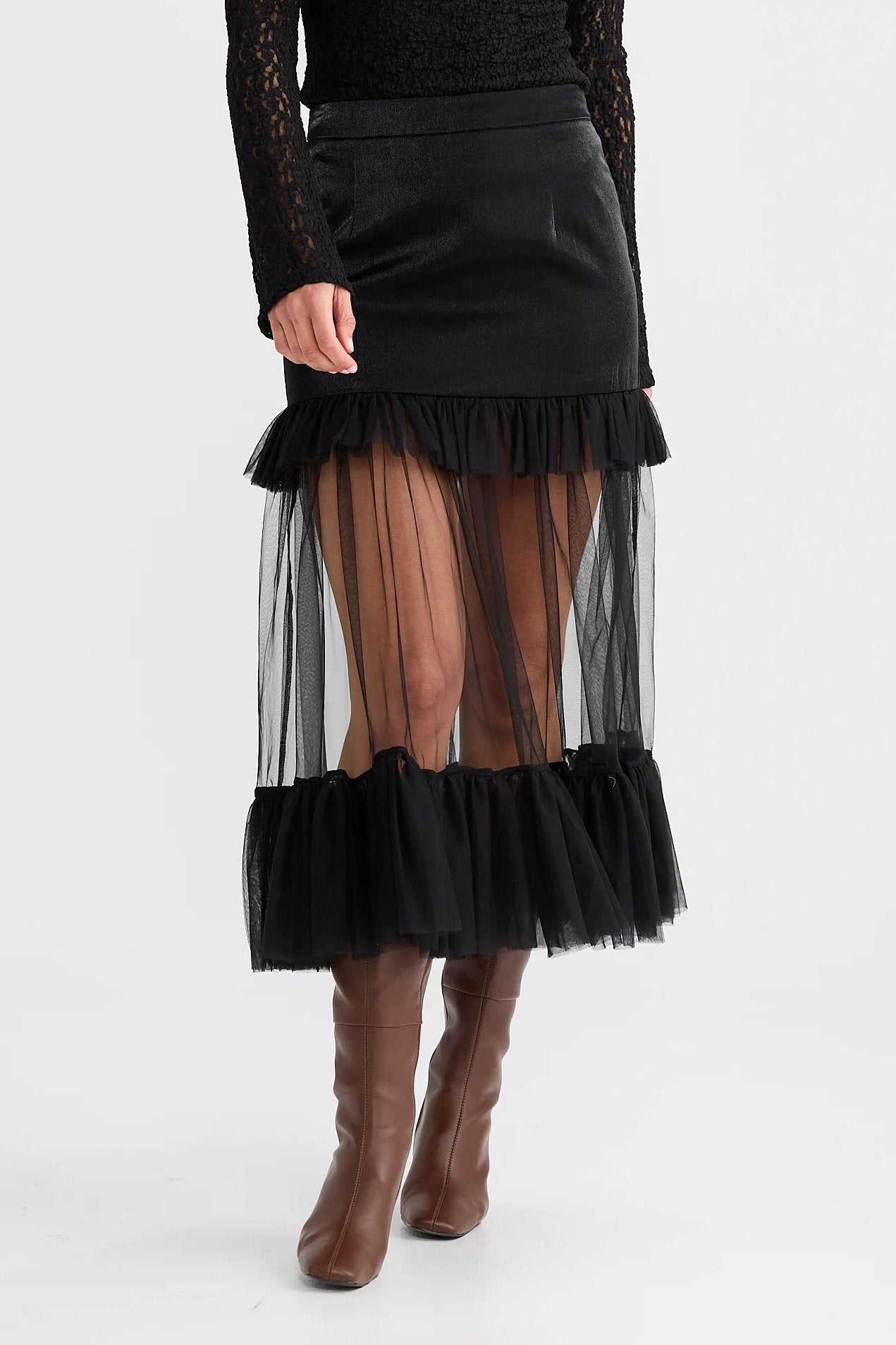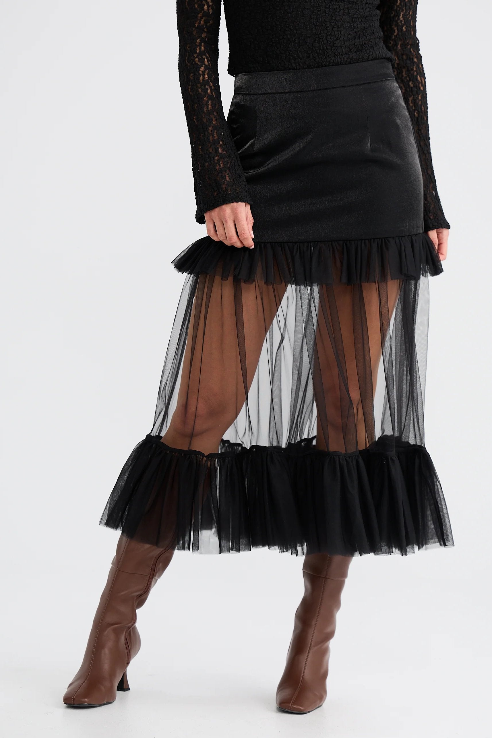 - Midi length with a sheer tulle panel extending below the mini skirt