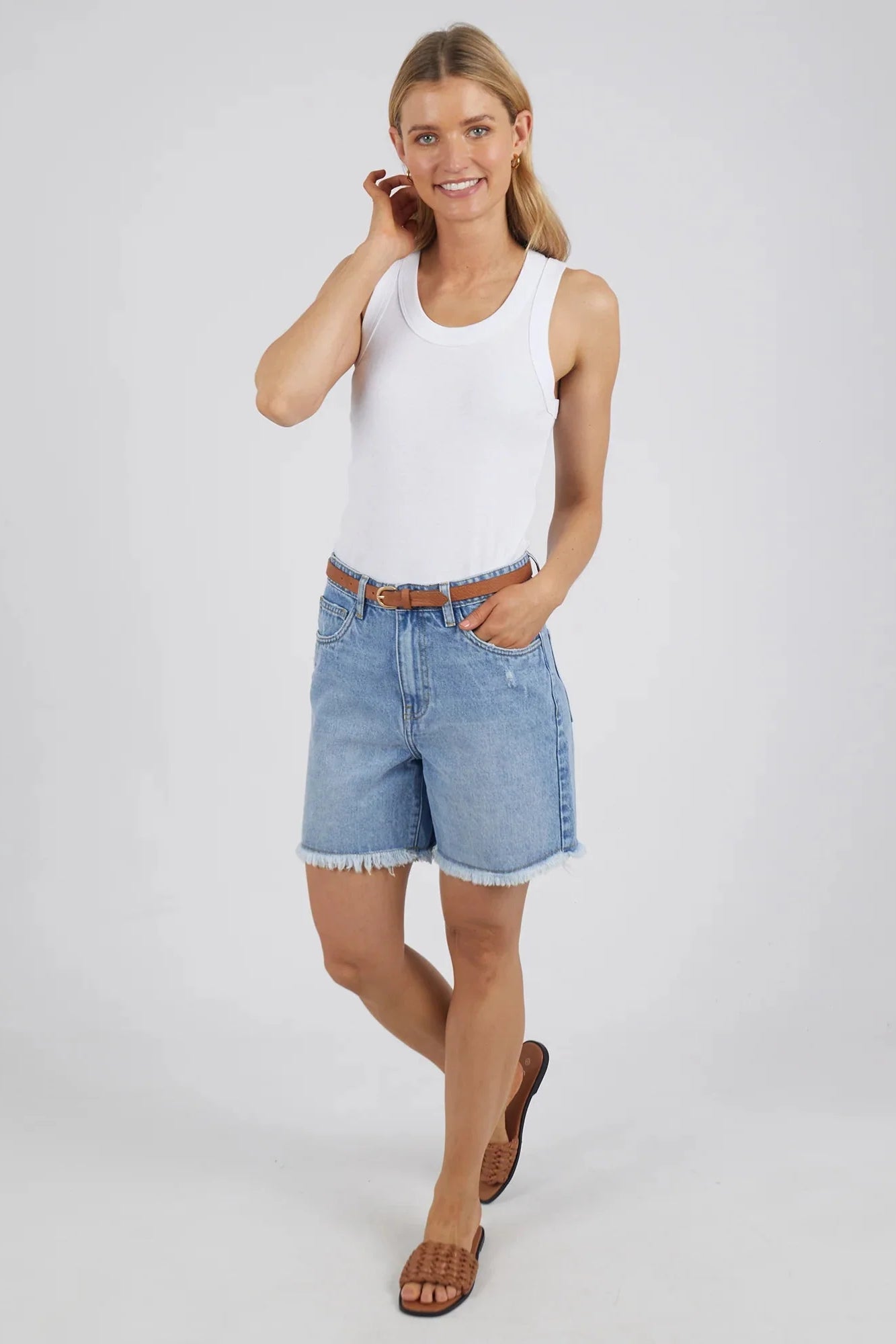 Your classic denim short featuring a frayed hem and slight distressing at the pocket, a great addition to every capsule everyday wardrobe.