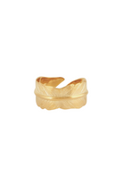 Gold plated ring, finely engraved in shaped of a feather. Also available is the gorgeous matching feather cuff in gold