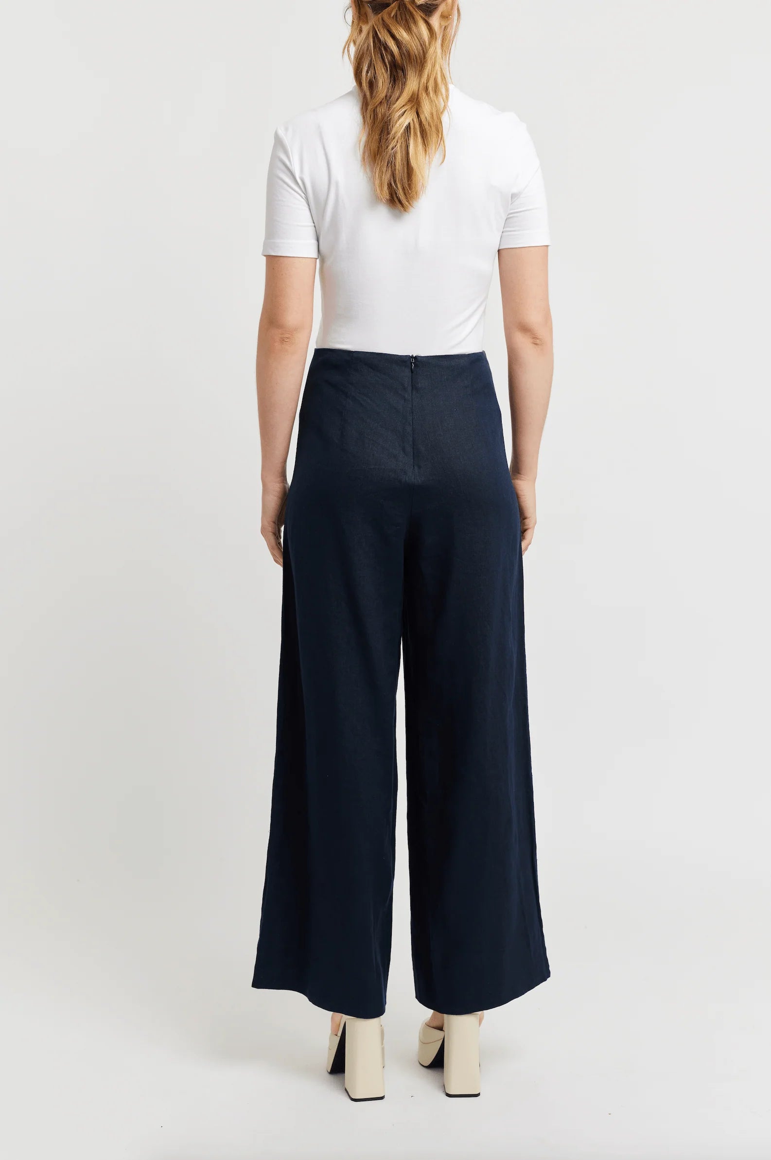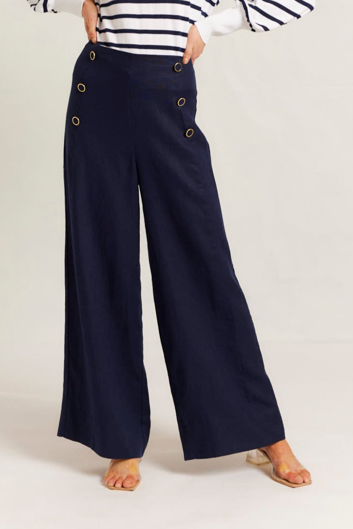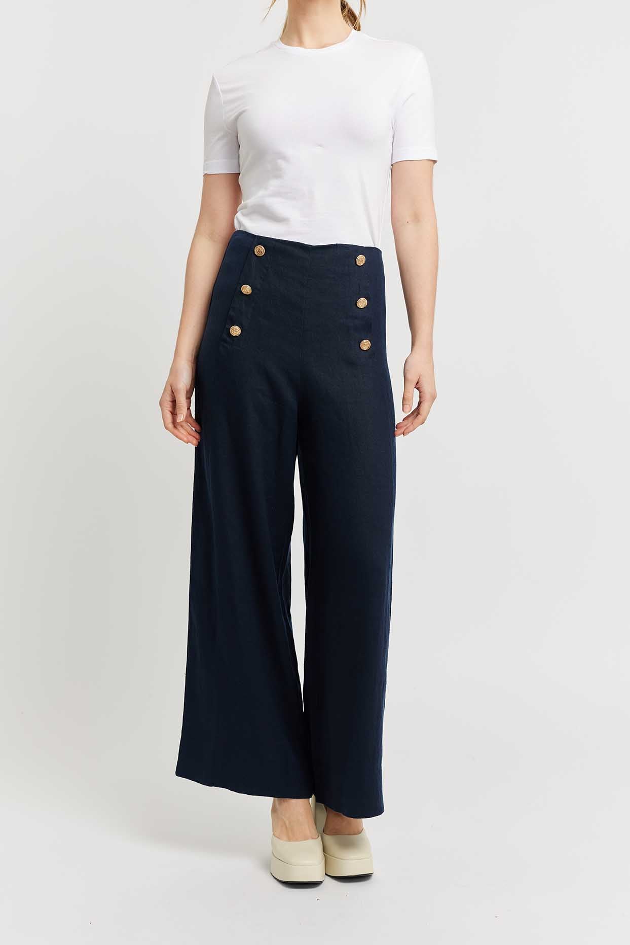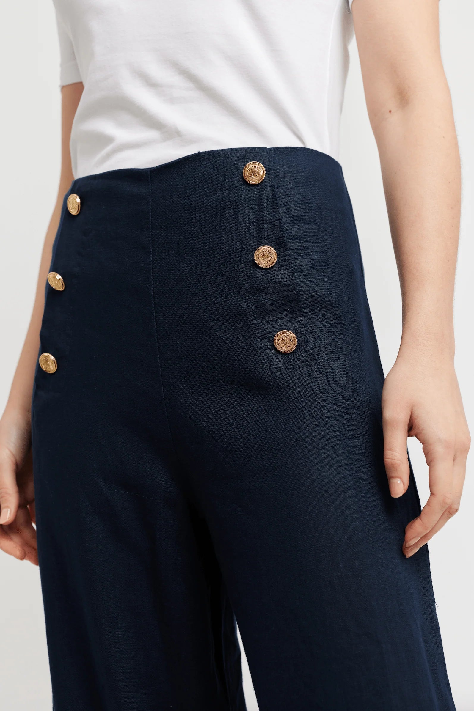 Bring a touch of sophistication to your wardrobe this summer with the Atlas Pant in Navy. Crafted with classic high-waisted tailoring, this linen pant exudes effortless elegance with its bold summer hues and gold button detailing. With its flattering fit and effortless style, the Atlas Pant will be your go-to staple piece during hot summer days. Also Available in Tangelo and Black.