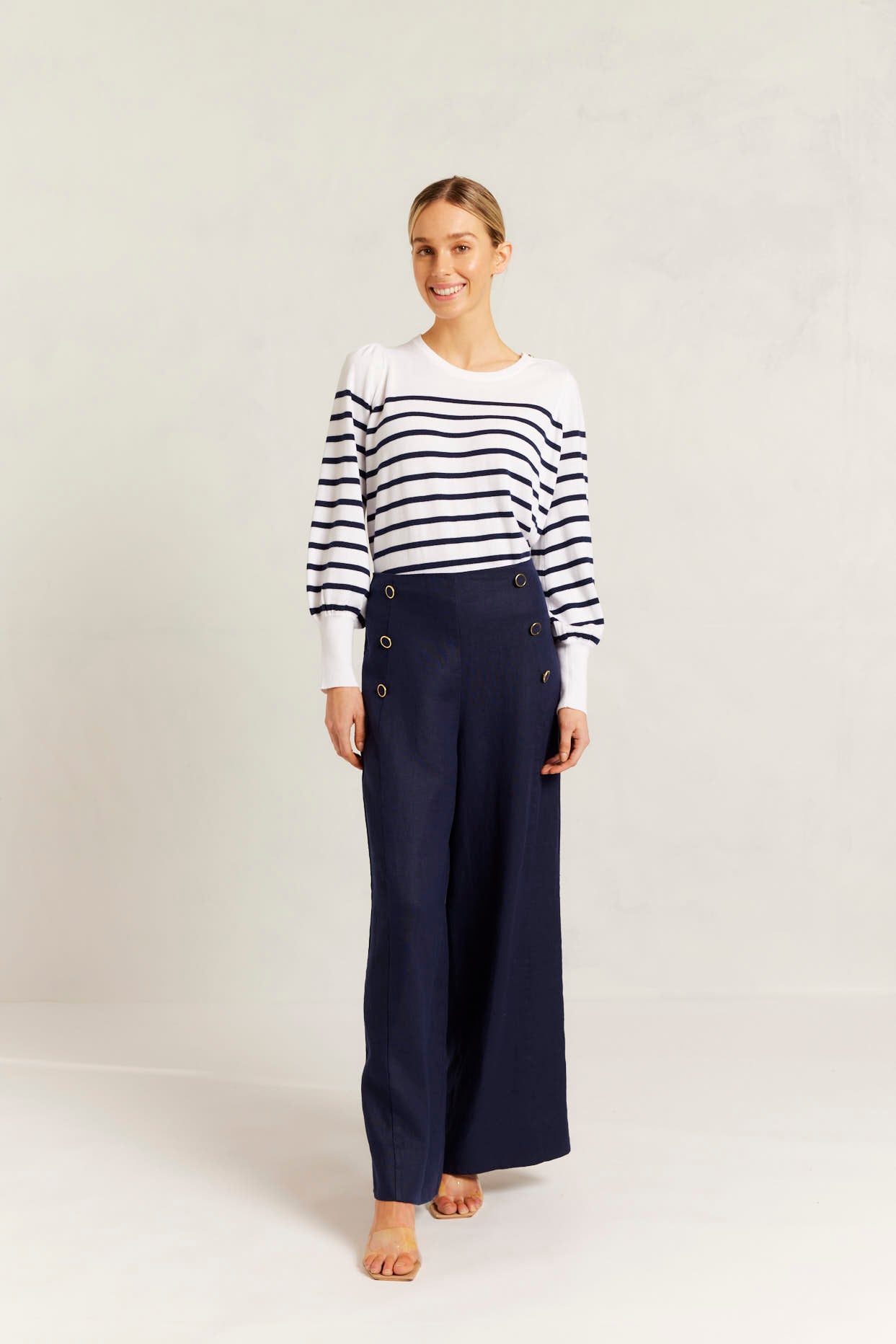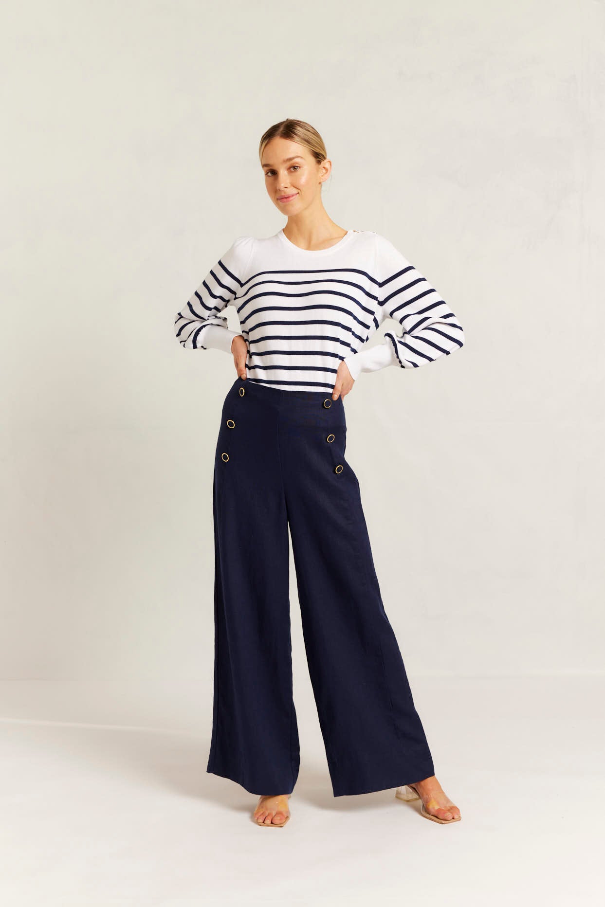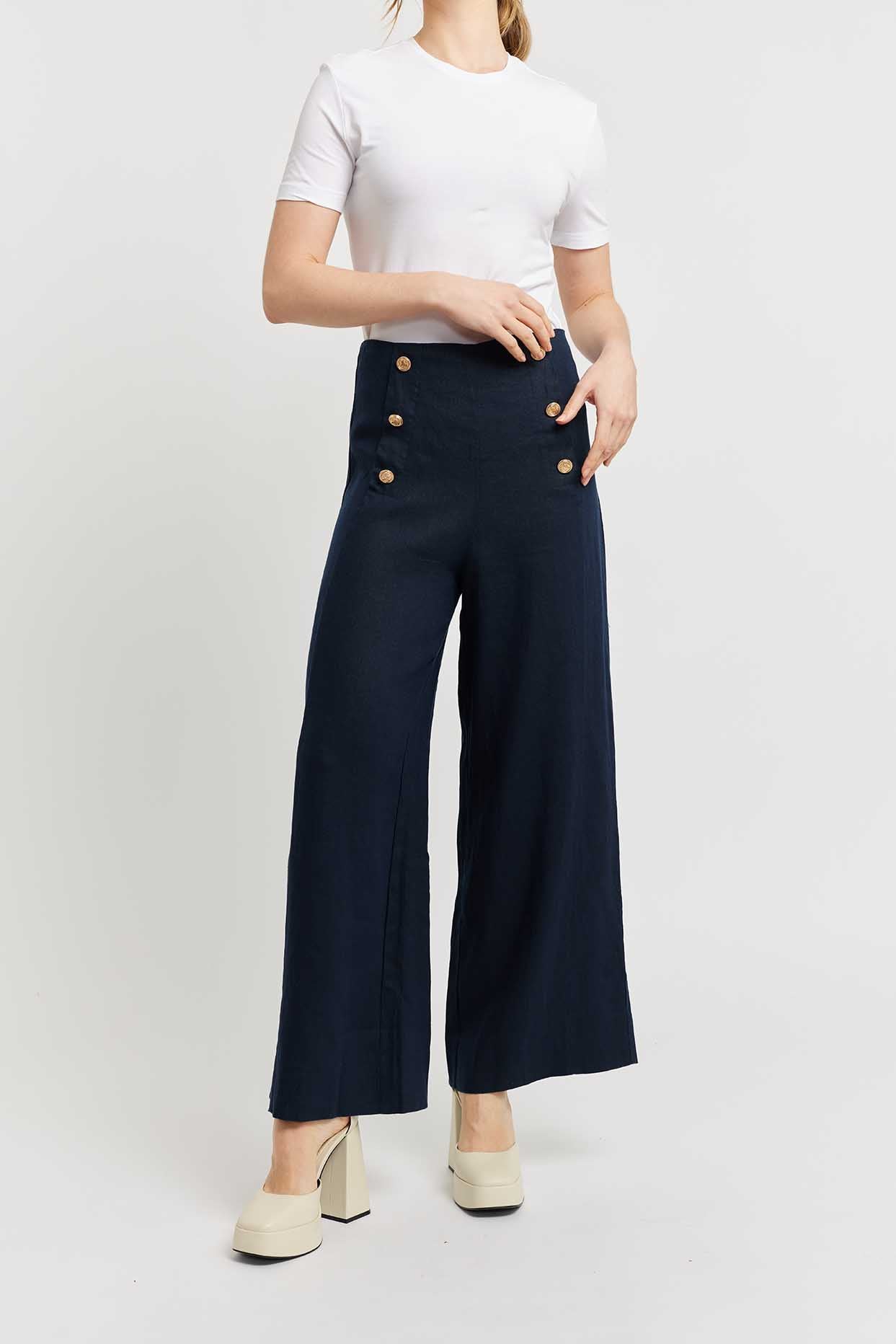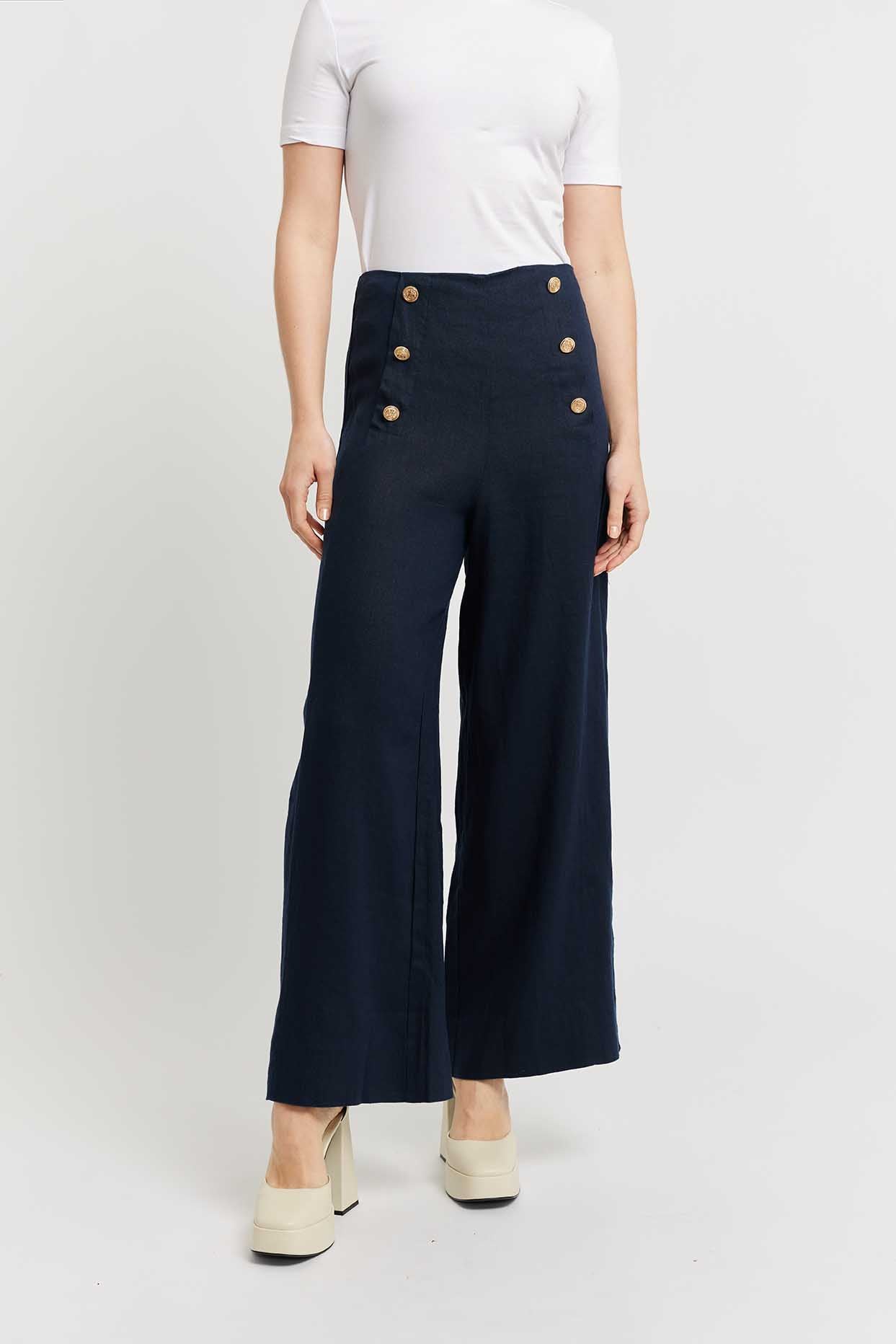 Bring a touch of sophistication to your wardrobe this summer with the Atlas Pant in Navy. Crafted with classic high-waisted tailoring, this linen pant exudes effortless elegance with its bold summer hues and gold button detailing. With its flattering fit and effortless style, the Atlas Pant will be your go-to staple piece during hot summer days. Also Available in Tangelo and Black.