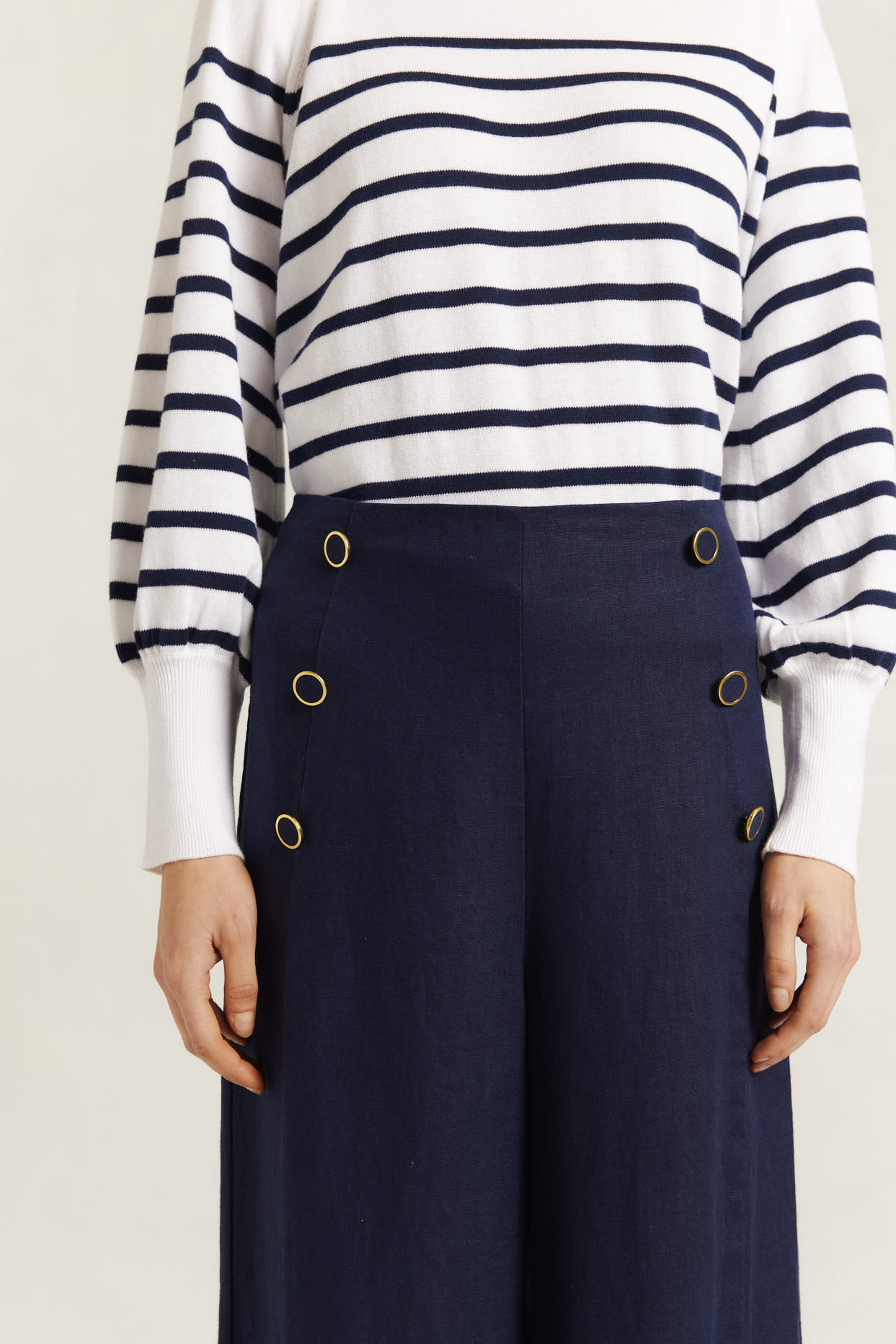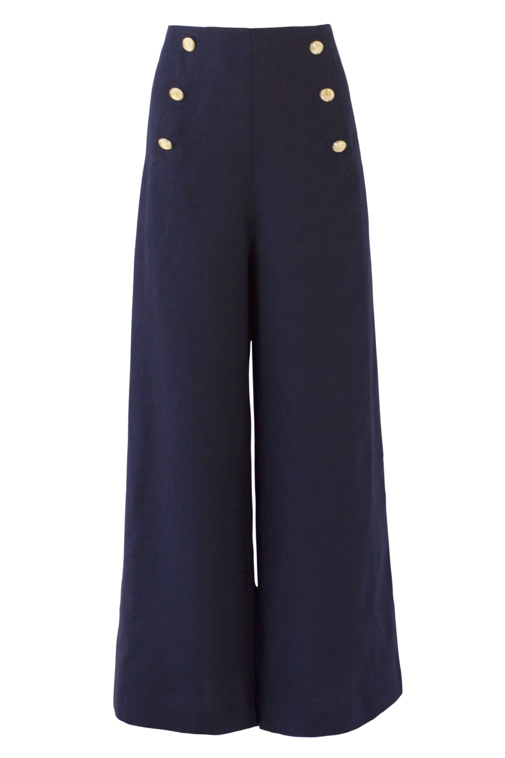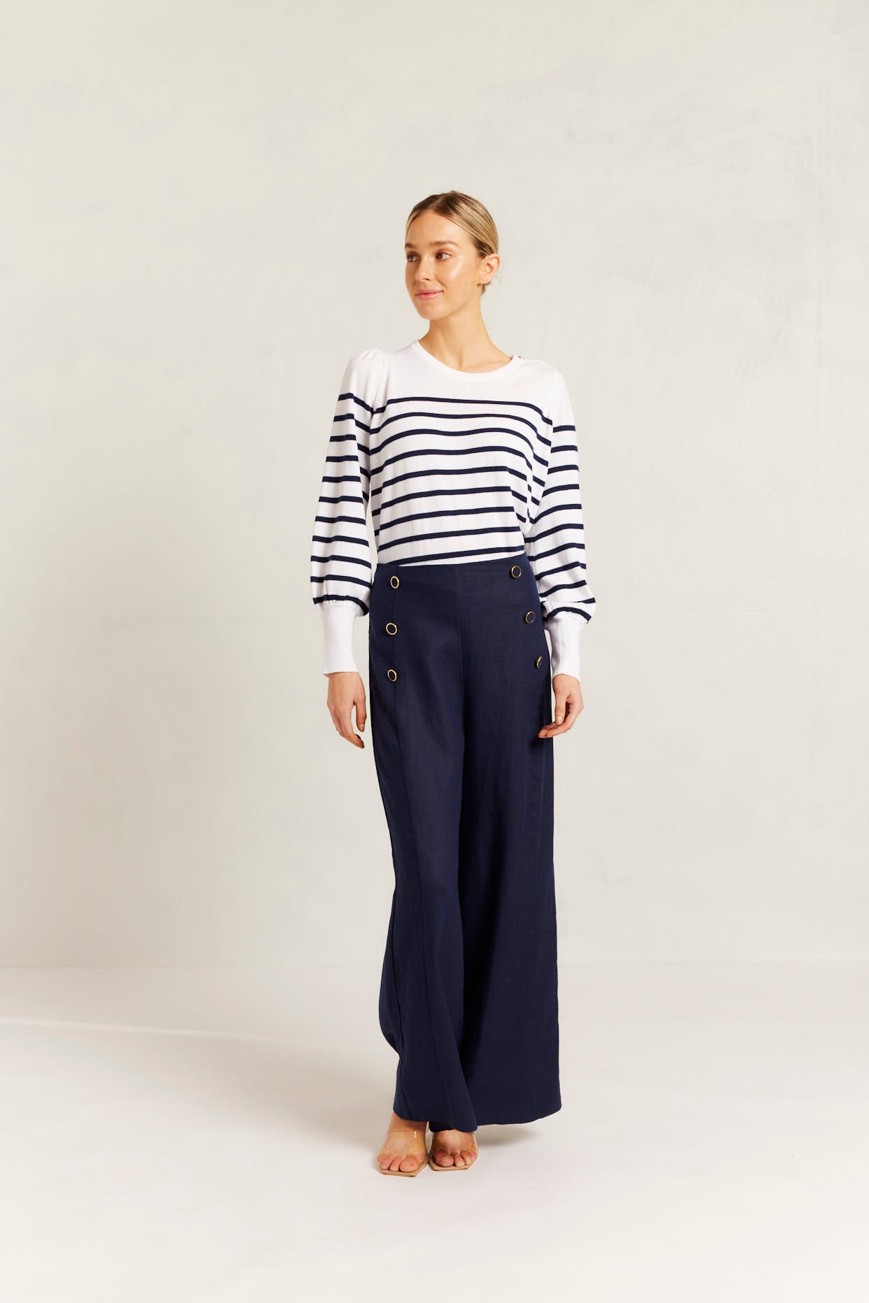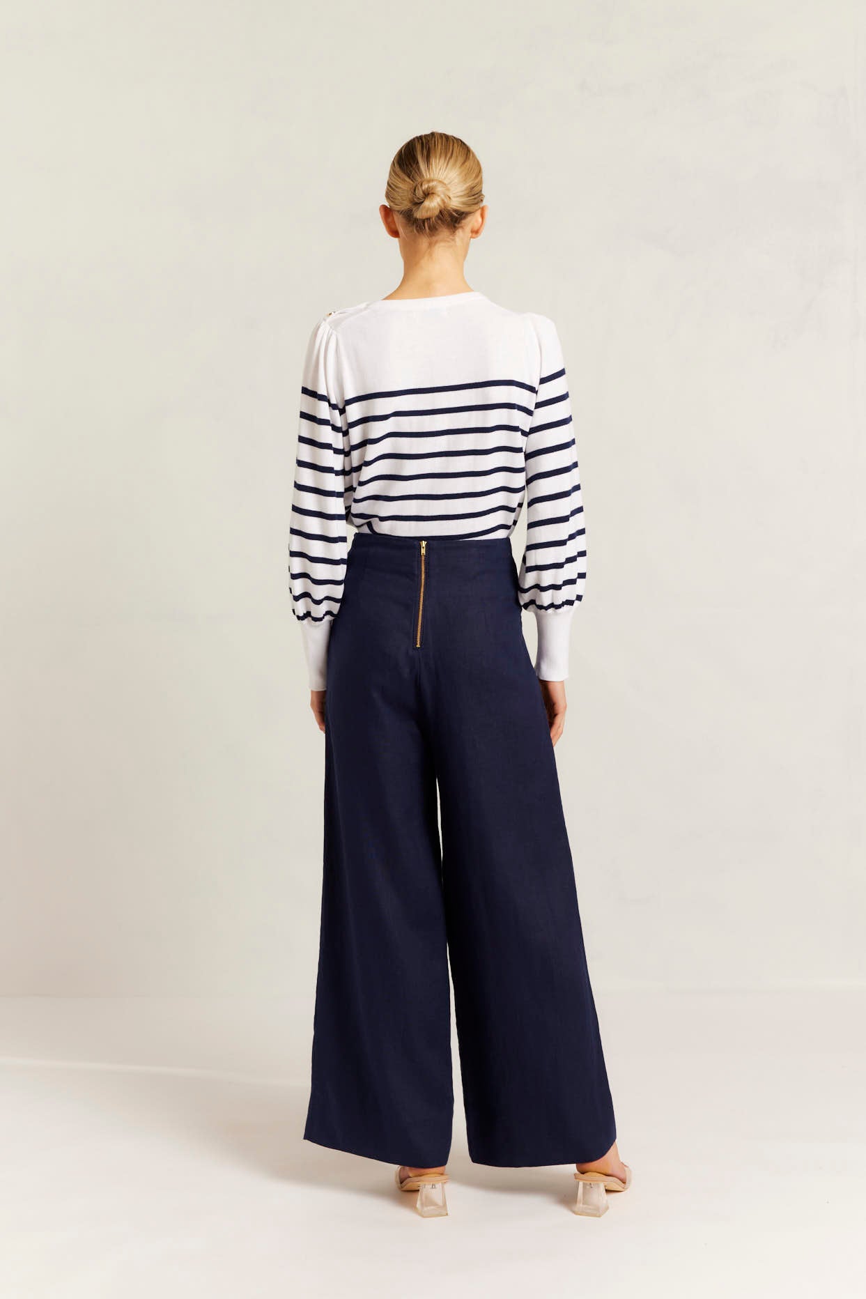 Bring a touch of sophistication to your wardrobe this summer with the Atlas Pant in Navy. Crafted with classic high-waisted tailoring, this linen pant exudes effortless elegance with its bold summer hues and gold button detailing. With its flattering fit and effortless style, the Atlas Pant will be your go-to staple piece during hot summer days. Also Available in Tangelo and Black.