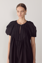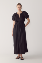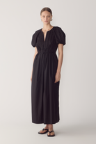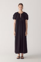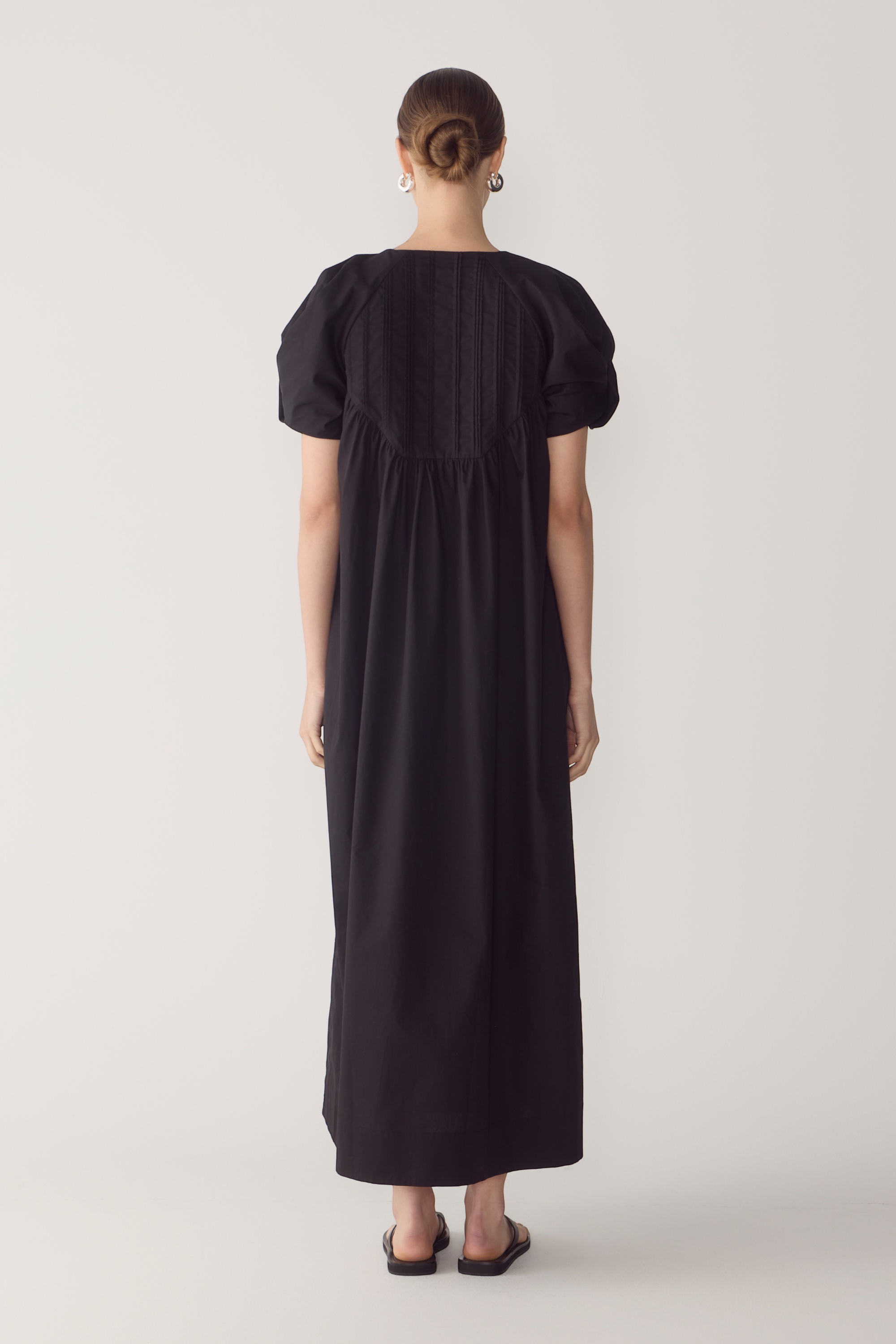 This dress reshapes a classic midi silhouette through considered detailing and soft structure. It features a round neckline with a subtle button and split opening, framed by a pleated bib panel with gentle gathering through the bodice. Raglan sleeves are finished with sculptural volume, created by a precise scissor pleat that adds depth and movement to the short sleeve. A fine self belt defines the waist, while side seam pockets and high side splits bring ease and functionality to the flowing skirt.