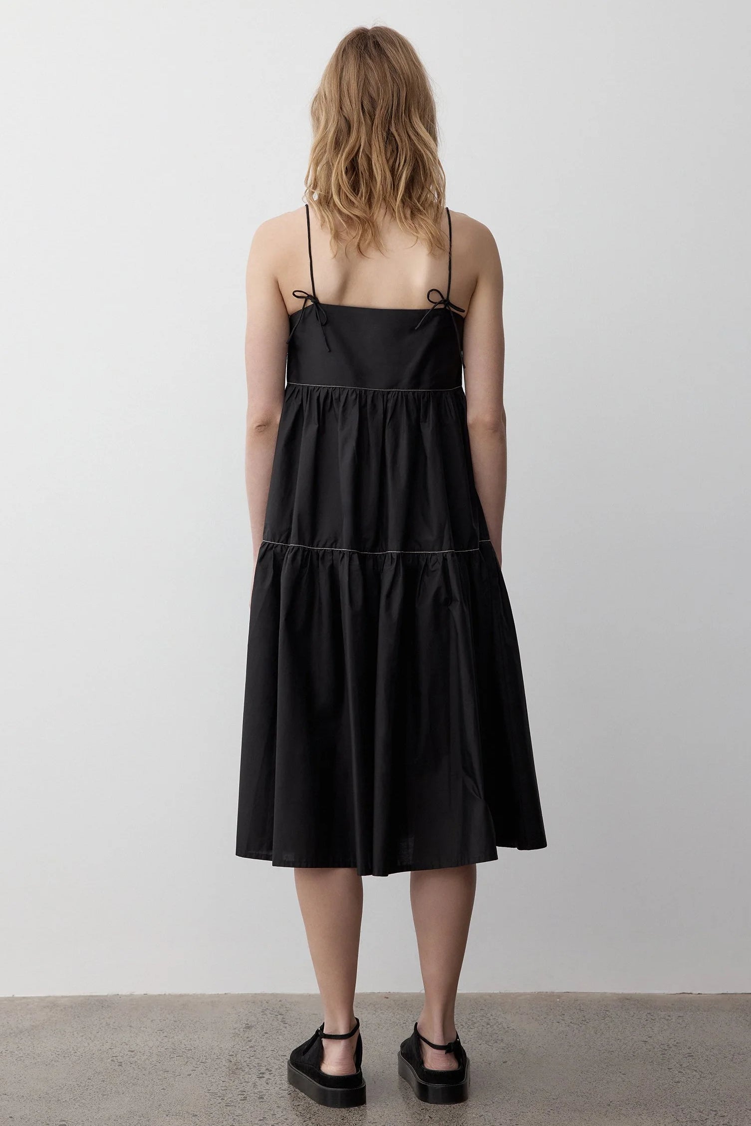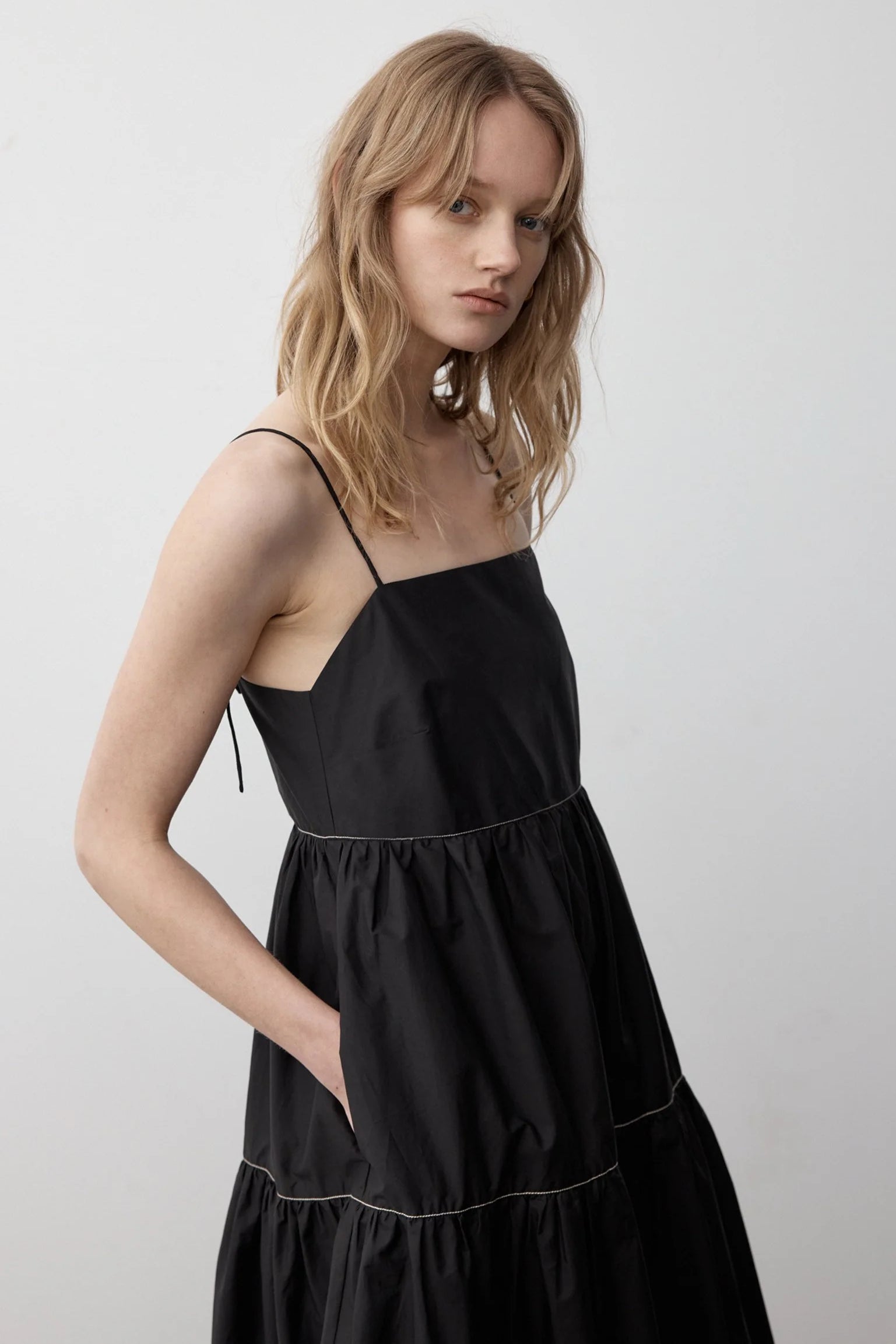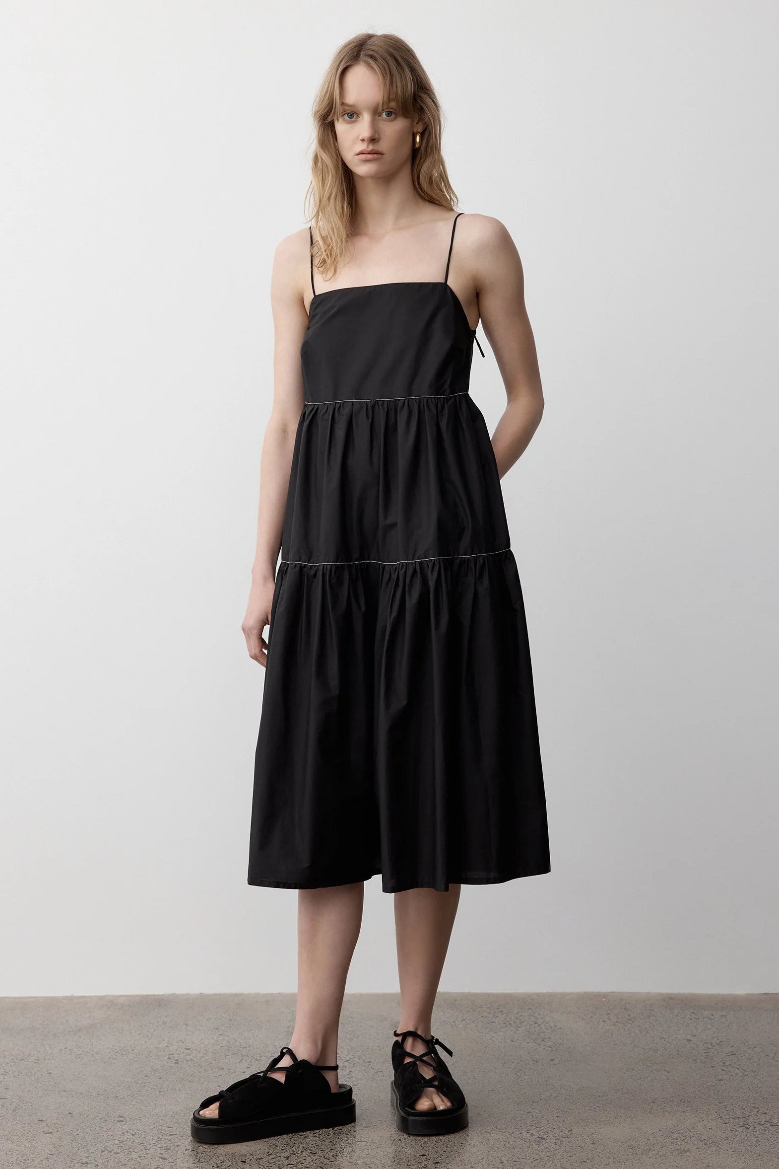 A classic midi dress featuring a straight neckline and the convenience of adjustable wisp thin shoulder ties. A tiered skirt with fine gathering creates gentle volume and falls below a fitted bodice. With side pockets and contrast stitching on each tier, this cotton poplin dress is a seasonless staple.