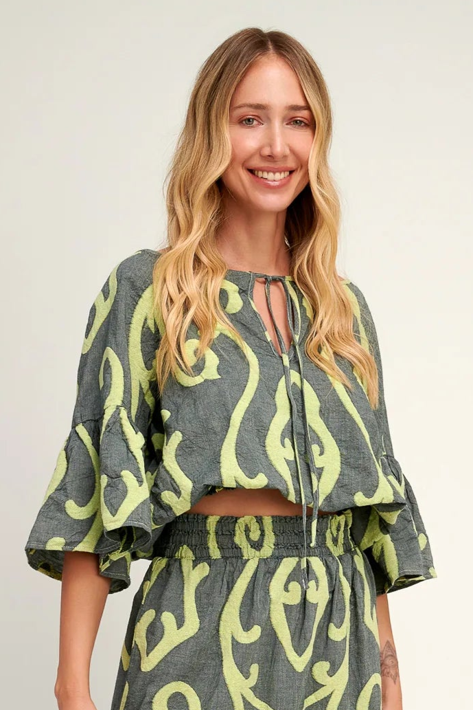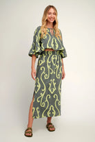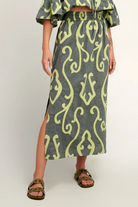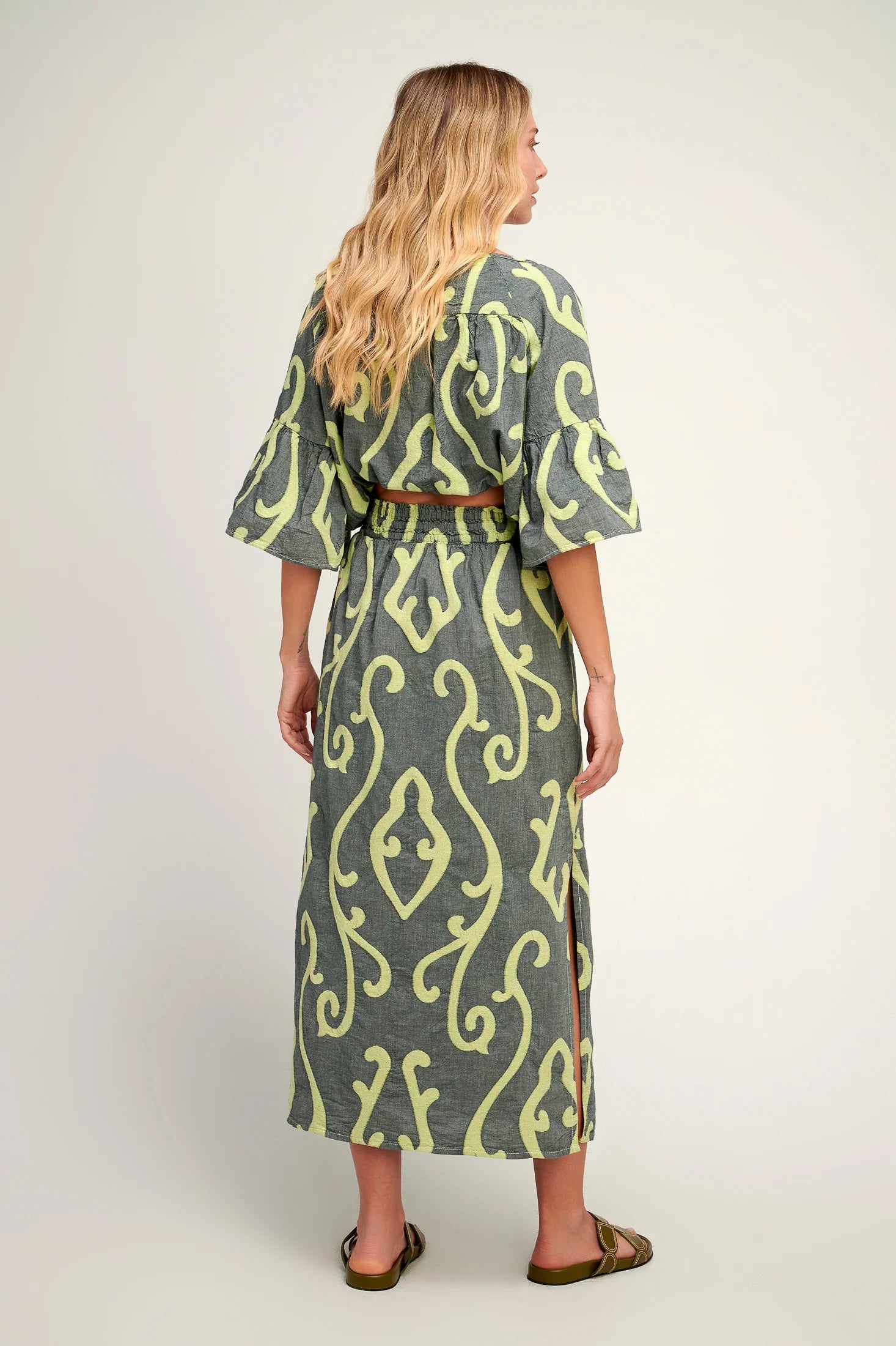 The Mykines Dark Green Zakar Set by Pearl & Caviar brings refined, understated elegance to your resort wardrobe, beautifully combining a boxy-style blouse with a sleek straight-cut skirt in a rich green Zakar jacquard. Crafted from 100% breathable cotton, the blouse features a soft, relaxed fit and chic neckline, while the skirt offers flattering structure and fluid movement courtesy of its side slits. Wear together for a coordinated look that balances comfort and sophistication, or pair individually with neutral staples for effortless versatility.