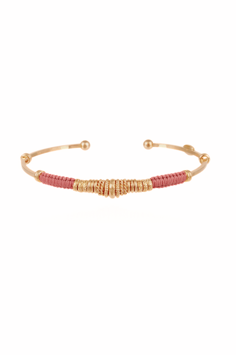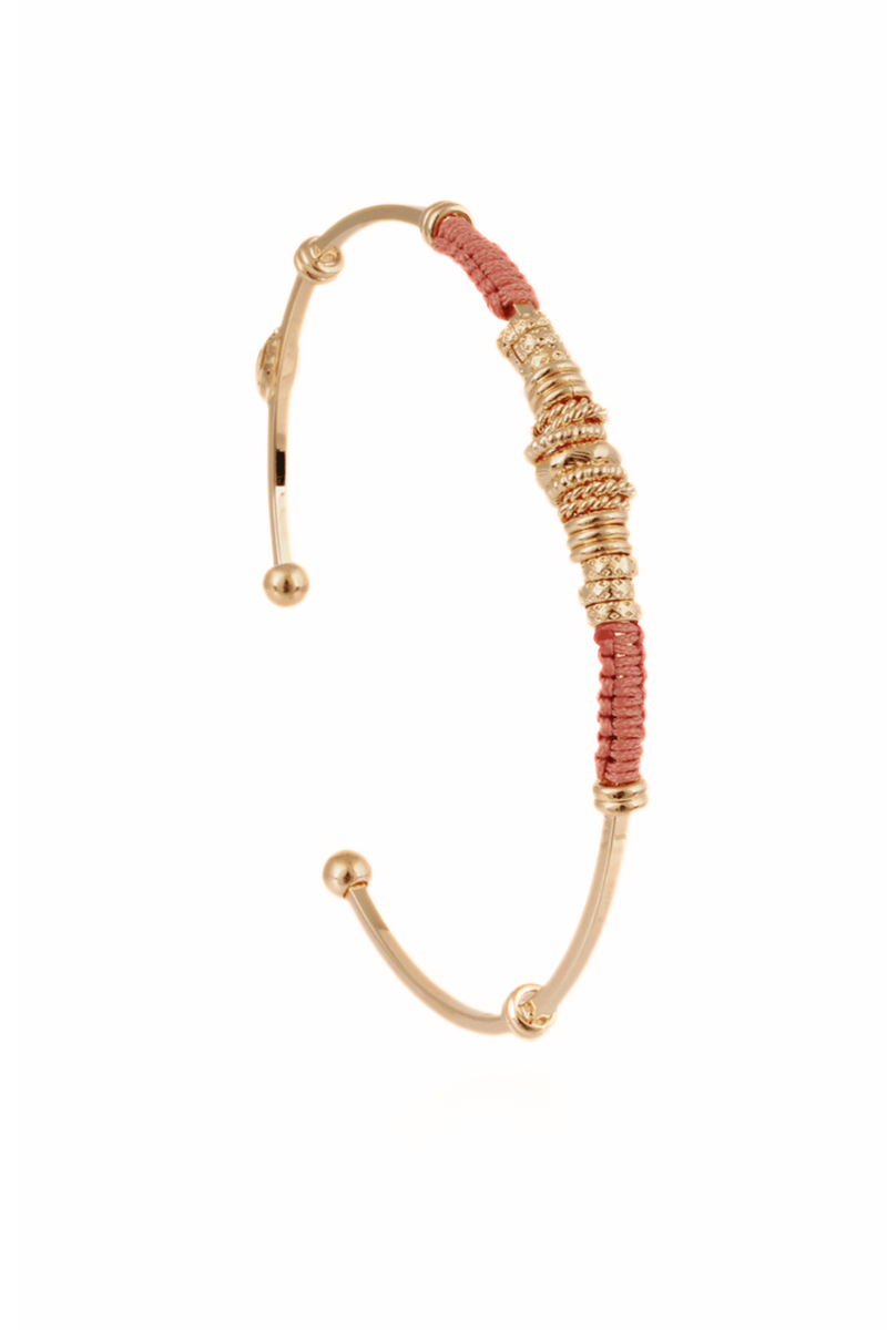 Gold plated bangle/cuff, wrapped in part by coloured threads and golden rings. For a lucky charm, we recommend wearing it with other bracelets to create the perfect combination.